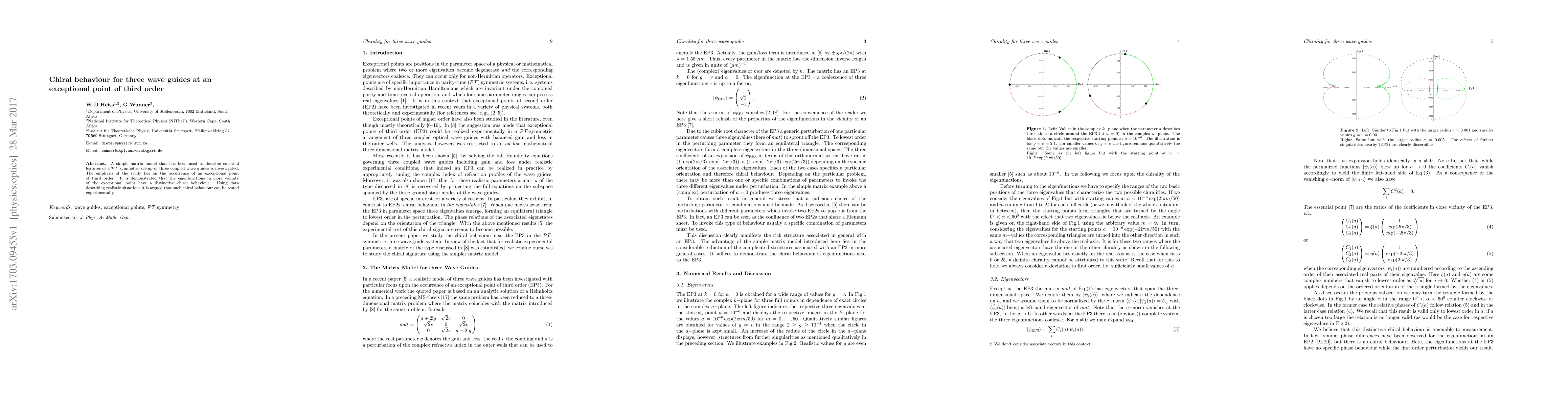 This research explores a matrix model of three coupled wave guides near an exceptional point of third order, revealing unique chiral behavior of eigenfunctions. The findings suggest potential for experimental verification in realistic scenarios.