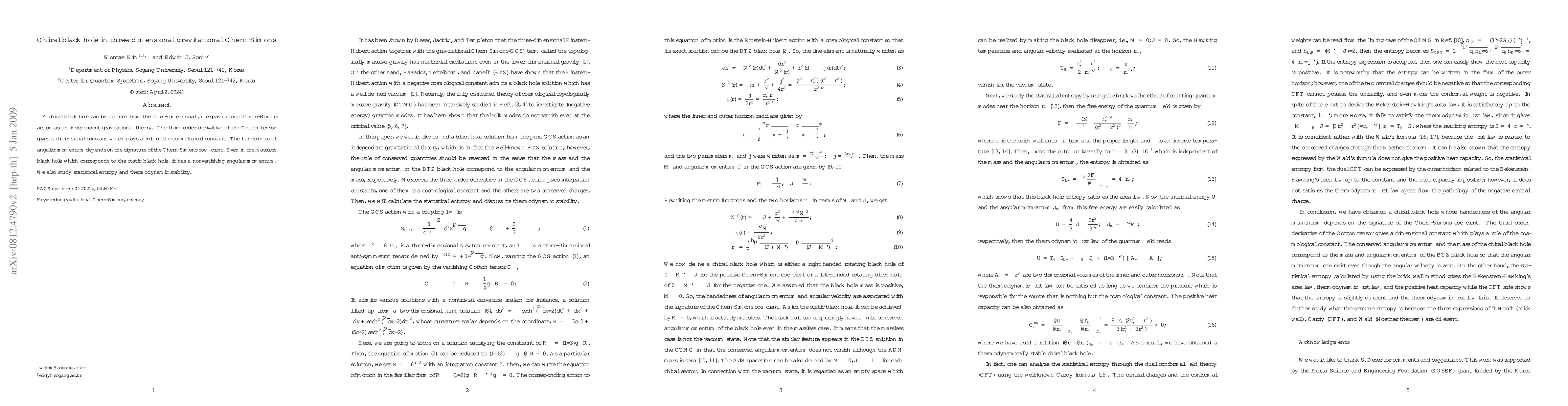 This paper explores a chiral black hole derived from three-dimensional gravitational Chern-Simons theory, where the Cotton tensor's third-order derivative acts as a cosmological constant. The black hole's angular momentum's handedness is linked to the Chern-Simons coefficient, and it exhibits nonvanishing angular momentum even in the massless case. The study also examines the statistical entropy and thermodynamic stability of the black hole.
