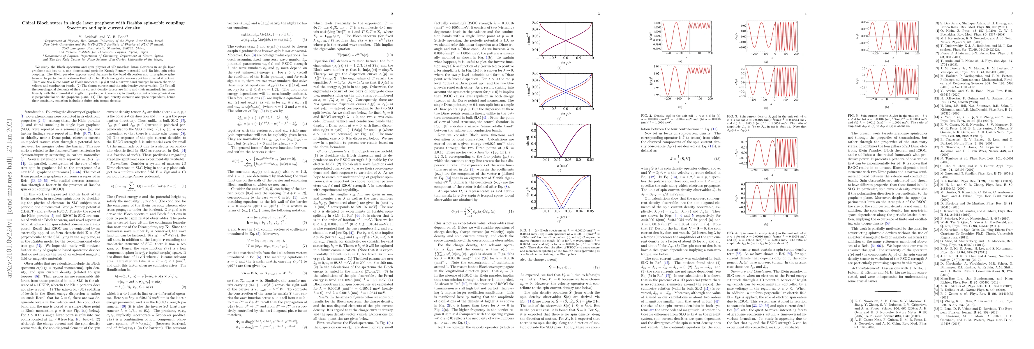 We study the Bloch spectrum and spin physics of 2D massless Dirac electrons in single layer graphene subject to a one dimensional periodic Kronig-Penney potential and Rashba spin-orbit coupling. The Klein paradox exposes novel features in the band dispersion and in graphene spintronics. In particular it is shown that: (1) The Bloch energy dispersion $\veps(p)$ has unusual structure: There are {\it two Dirac points} at Bloch momenta $\pm p \ne 0$ and a narrow band emerges between the wide valence and conduction bands. (2) The charge current and the spin density vector vanish. (3) Yet, all the non-diagonal elements of the spin current density tensor are finite and their magnitude increases linearly with the spin-orbit strength. In particular, there is a spin density current whose polarization is perpendicular to the graphene plane. (4) The spin density currents are space-dependent, hence their continuity equation includes a finite spin torque density.
