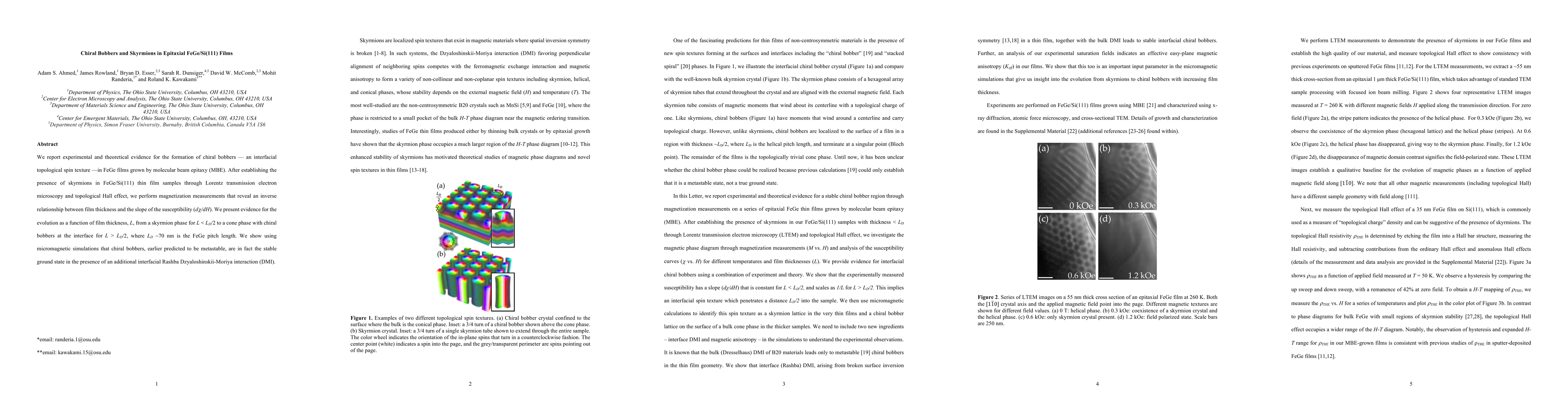 The paper presents evidence for chiral bobbers, a topological spin texture, in epitaxial FeGe/Si(111) films using MBE, Lorentz microscopy, and magnetization measurements. Micromagnetic simulations suggest chiral bobbers are stable due to an interfacial Rashba DMI, evolving from skyrmions to cone phase with increasing film thickness.