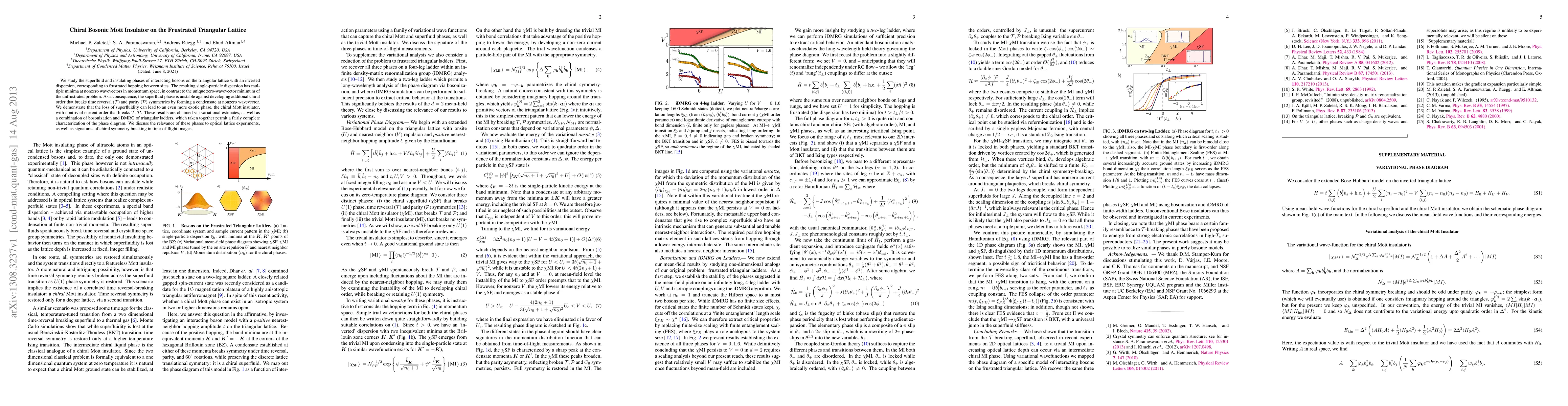 We study the superfluid and insulating phases of interacting bosons on the triangular lattice with an inverted dispersion, corresponding to frustrated hopping between sites. The resulting single-particle dispersion has multiple minima at nonzero wavevectors in momentum space, in contrast to the unique zero-wavevector minimum of the unfrustrated problem. As a consequence, the superfluid phase is unstable against developing additonal chiral order that breaks time reversal (T) and parity (P) symmetries by forming a condensate at nonzero wavevector. We demonstrate that the loss of superfluidity can lead to an even more exotic phase, the chiral Mott insulator, with nontrivial current order that breaks T, P. These results are obtained via variational estimates, as well as a combination of bosonization and DMRG of triangular ladders, which taken together permit a fairly complete characterization of the phase diagram. We discuss the relevance of these phases to optical lattice experiments, as well as signatures of chiral symmetry breaking in time-of-flight images.