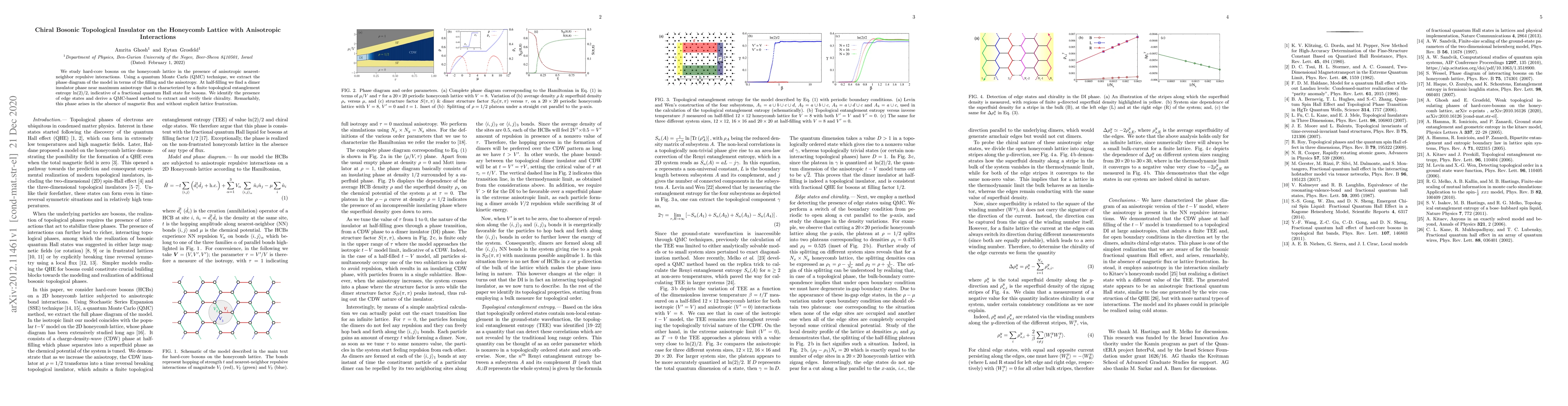The study investigates hard-core bosons on a honeycomb lattice with anisotropic interactions, revealing a chiral bosonic topological insulator phase at half-filling and maximum anisotropy, characterized by a fractional quantum Hall state and chiral edge states verified via quantum Monte Carlo techniques.
