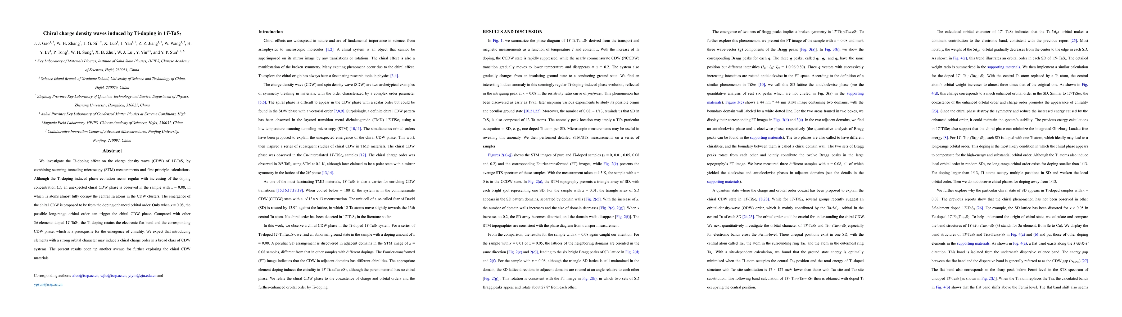 Ti-doping in 1T-TaS2 induces a chiral charge density wave phase at a specific doping concentration, revealing the role of orbital order in chirality. This discovery suggests a new pathway for creating chiral charge orders in various CDW systems.