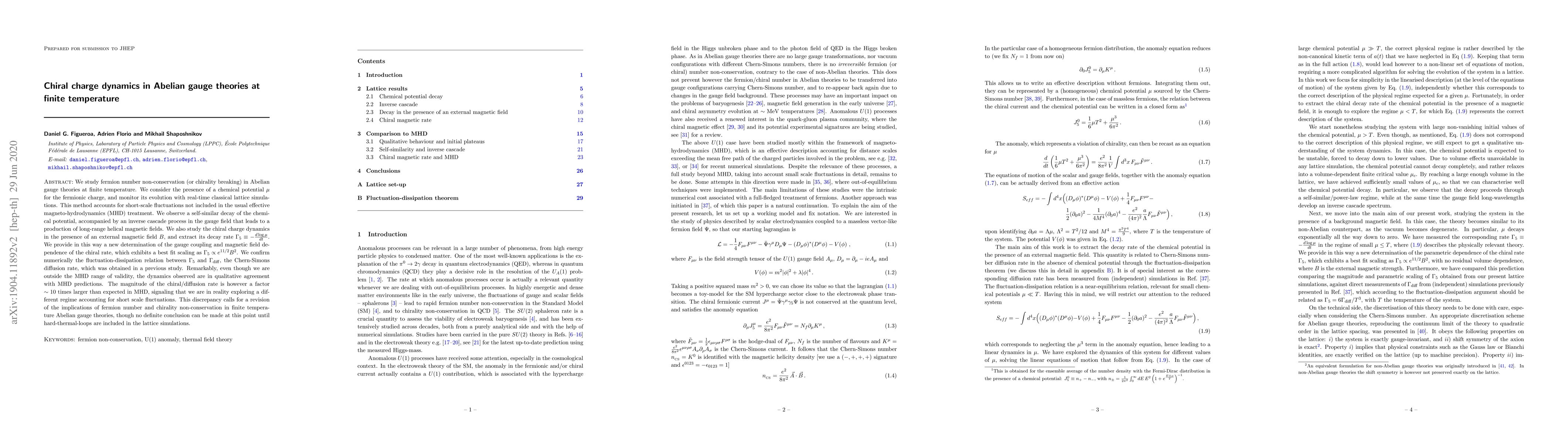 We study fermion number non-conservation (or chirality breaking) in Abelian gauge theories at finite temperature. We consider the presence of a chemical potential $\mu$ for the fermionic charge, and monitor its evolution with real-time classical lattice simulations. This method accounts for short-scale fluctuations not included in the usual effective magneto-hydrodynamics (MHD) treatment. We observe a self-similar decay of the chemical potential, accompanied by an inverse cascade process in the gauge field that leads to a production of long-range helical magnetic fields. We also study the chiral charge dynamics in the presence of an external magnetic field $B$, and extract its decay rate $\Gamma_5 \equiv -{d\log \mu\over dt}$. We provide in this way a new determination of the gauge coupling and magnetic field dependence of the chiral rate, which exhibits a best fit scaling as $\Gamma_5 \propto e^{11/2}B^2$. We confirm numerically the fluctuation-dissipation relation between $\Gamma_5$ and $\Gamma_{\rm diff}$, the Chern-Simons diffusion rate, which was obtained in a previous study. Remarkably, even though we are outside the MHD range of validity, the dynamics observed are in qualitative agreement with MHD predictions. The magnitude of the chiral/diffusion rate is however a factor $\sim 10$ times larger than expected in MHD, signaling that we are in reality exploring a different regime accounting for short scale fluctuations. This discrepancy calls for a revision of the implications of fermion number and chirality non-conservation in finite temperature Abelian gauge theories, though not definite conclusion can be made at this point until hard-thermal-loops (HTL) are included in the lattice simulations.