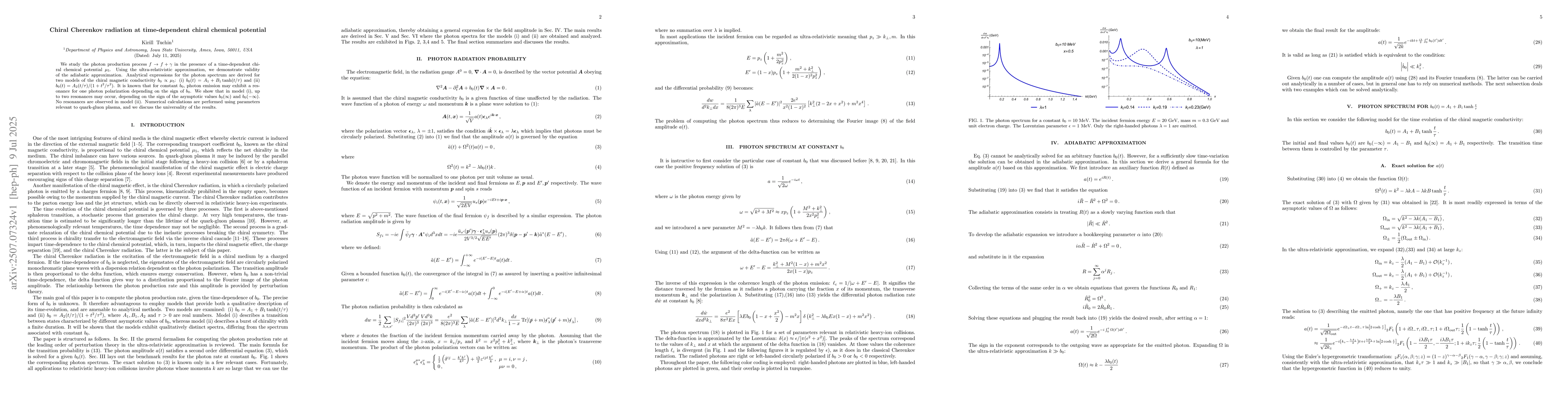 We study the photon production process $f\to f+\gamma$ in the presence of a time-dependent chiral chemical potential $\mu_5$. Using the ultra-relativistic approximation, we demonstrate validity of the adiabatic approximation. Analytical expressions for the photon spectrum are derived for two models of the chiral magnetic conductivity $b_0\propto \mu_5$: (i) $b_0(t)= A_1+B_1\tanh(t/\tau)$ and (ii) $b_0(t)= A_2(t/\tau)/(1+t^2/\tau^2)$. It is known that for constant $b_0$, photon emission may exhibit a resonance for one photon polarization depending on the sign of $b_0$. We show that in model (i), up to two resonances may occur, depending on the sign of the asymptotic values $b_0(\infty)$ and $b_0(-\infty)$. No resonances are observed in model (ii). Numerical calculations are performed using parameters relevant to quark-gluon plasma, and we discuss the universality of the results.