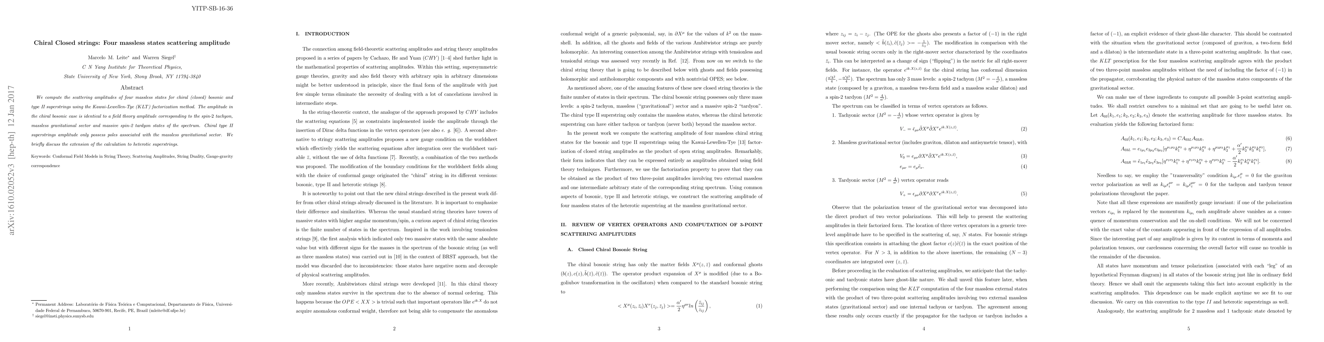 We compute the scattering amplitudes of four massless states for chiral (closed) bosonic and type II superstrings using the Kawai-Lewellen-Tye ($KLT$) factorization method. The amplitude in the chiral bosonic case is identical to a field theory amplitude corresponding to the spin-$2$ tachyon, massless gravitational sector and massive spin-2 tardyon states of the spectrum. Chiral type II superstrings amplitude only possess poles associated with the massless gravitational sector. We briefly discuss the extension of the calculation to heterotic superstrings.