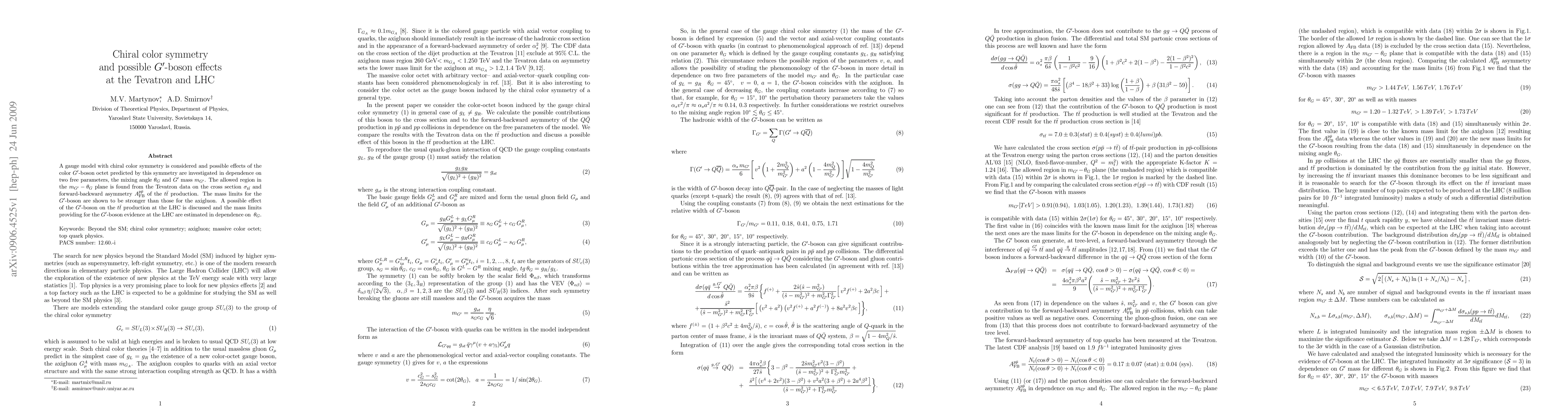 This study explores a gauge model with chiral color symmetry, investigating potential effects of the color $G'$-boson octet, which is predicted by this symmetry. Results show stricter mass limits for the $G'$-boson compared to axigluons, derived from Tevatron data on $t\bar{t}$ production, and estimates the $G'$-boson's impact on $t\bar{t}$ production at the LHC.