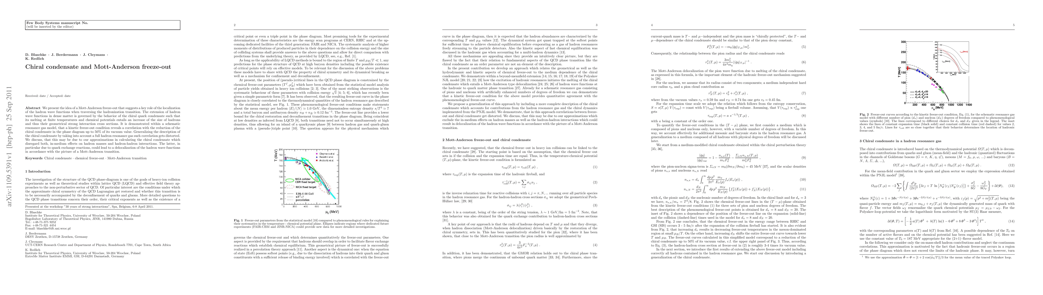 We present the idea of a Mott-Anderson freeze-out that suggests a key role of the localization of the hadron wave functions when traversing the hadronization transition. The extension of hadron wave functions in dense matter is governed by the behavior of the chiral quark condensate such that its melting at finite temperatures and chemical potentials entails an increase of the size of hadrons and thus their geometrical strong interaction cross sections. It is demonstrated within a schematic resonance gas model, that a kinetic freeze-out condition reveals a correlation with the reduction of the chiral condensate in the phase diagram up to 50 % of its vacuum value. Generalizing the description of the chiral condensate by taking into account a full hadron resonance gas such correlation gets distorted. We discuss, that this may be due to our approximations in calculating the chiral condensate which disregard both, in-medium effects on hadron masses and hadron-hadron interactions. The latter, in particular due to quark exchange reactions, could lead to a delocalization of the hadron wave functions in accordance with the picture of a Mott-Anderson transition.