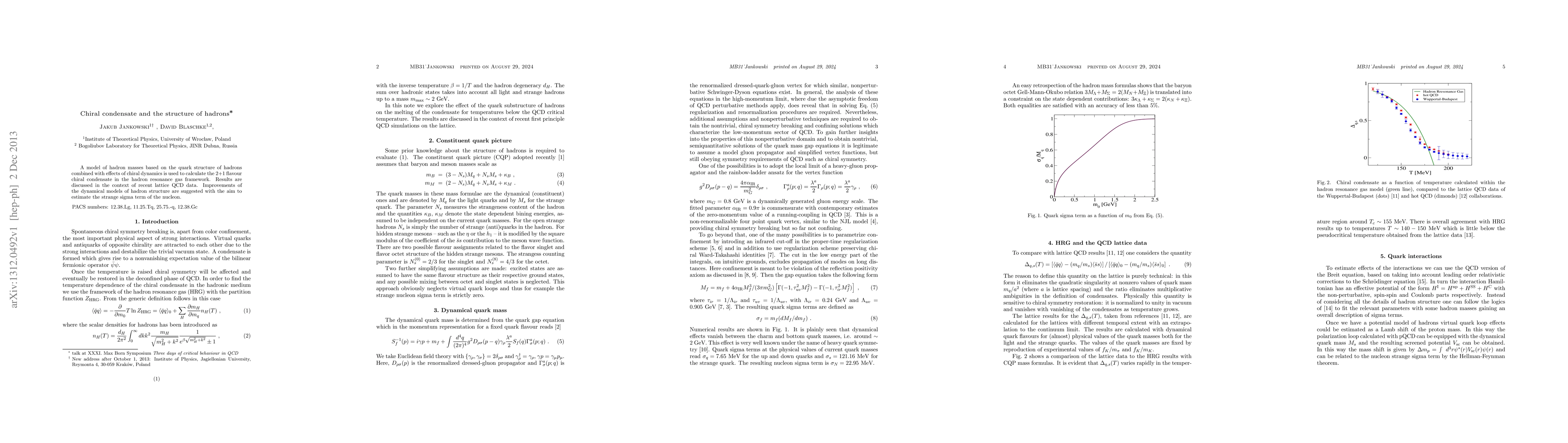 This paper models hadron masses by integrating quark structure and chiral dynamics, calculating the 2+1 flavour chiral condensate within the hadron resonance gas framework. It discusses these findings in relation to recent lattice QCD data and proposes enhancements to dynamical hadron models to better estimate the strange sigma term of the nucleon.