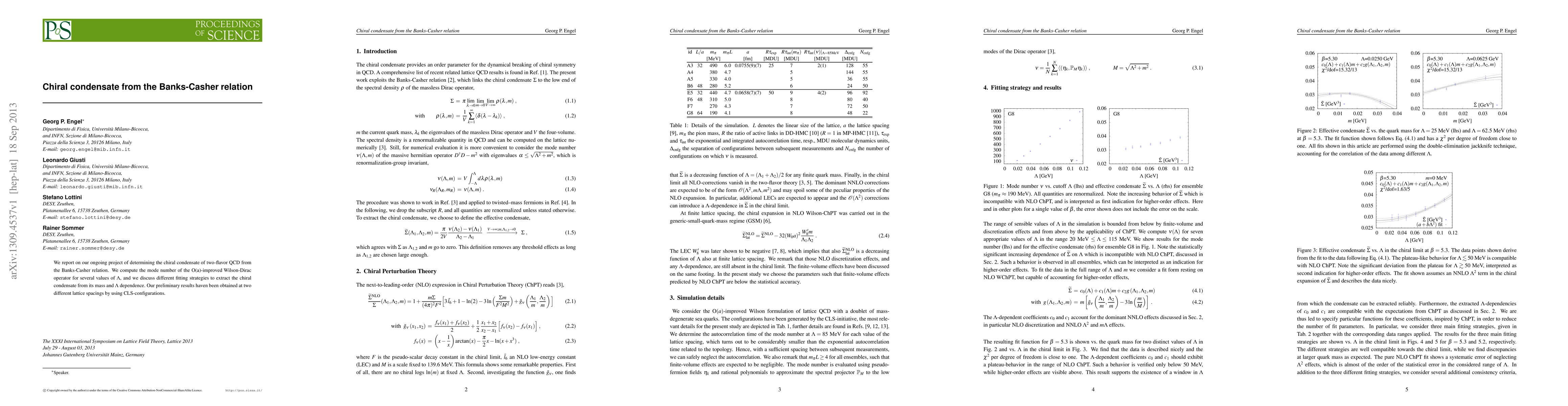 We report on our ongoing project of determining the chiral condensate of two-flavor QCD from the Banks-Casher relation. We compute the mode number of the O(a)-improved Wilson-Dirac operator for several values of \Lambda, and we discuss different fitting strategies to extract the chiral condensate from its mass and \Lambda dependence. Our preliminary results haven been obtained at two different lattice spacings by using CLS-configurations.