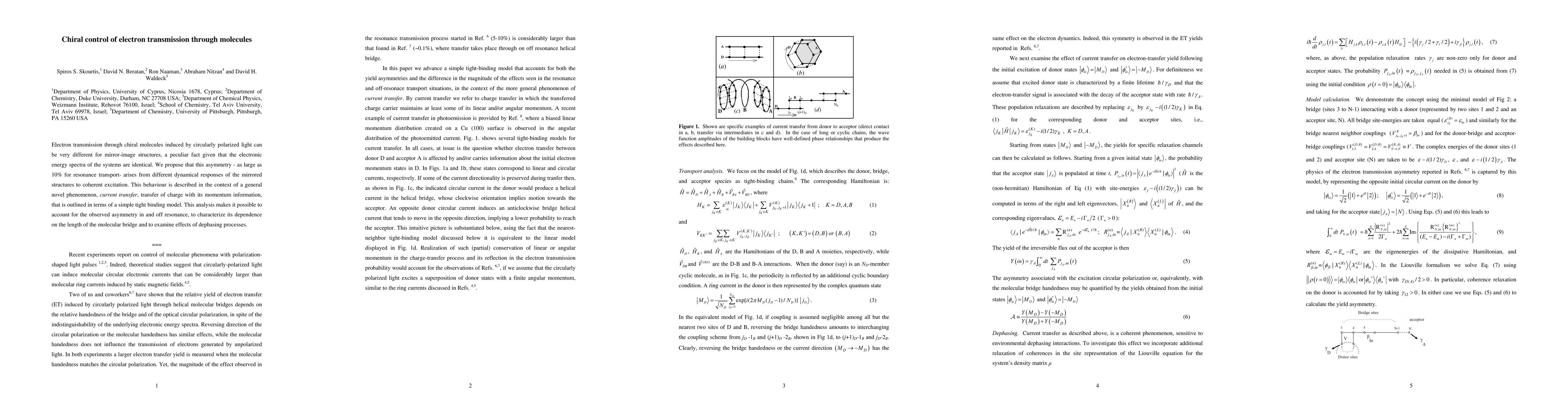 This paper explores how chiral molecules exhibit different electron transmission rates when exposed to circularly polarized light, despite having identical electronic energy spectra. The observed asymmetry, up to 10% in resonance transport, is attributed to the distinct dynamical responses of mirror-image structures to coherent excitation, analyzed through a novel concept called current transfer.