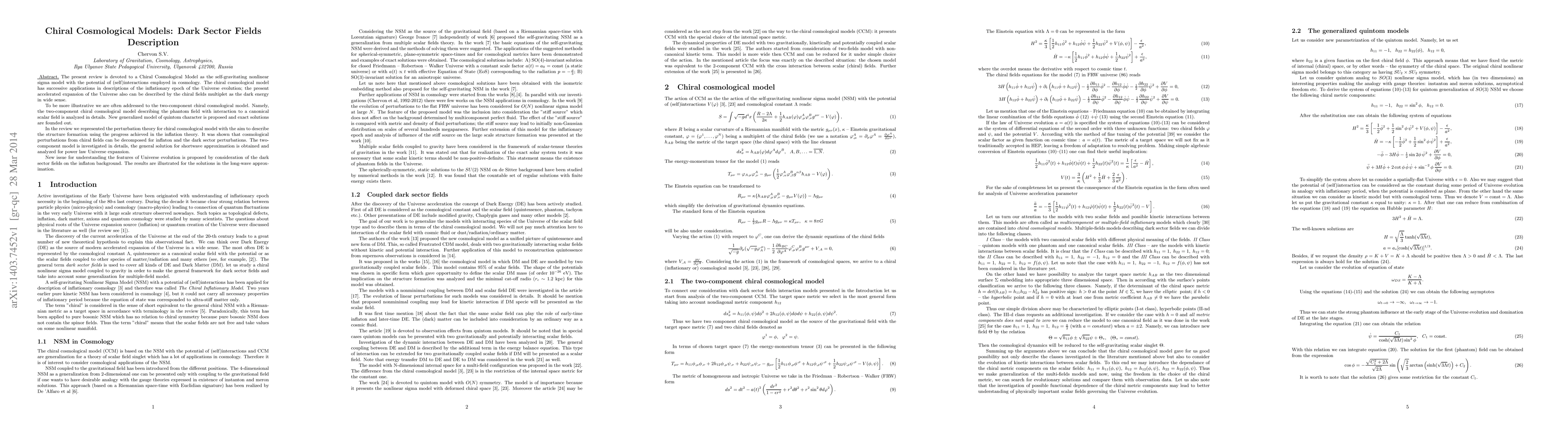 The present review is devoted to a Chiral Cosmological Model as the self-gravitating nonlinear sigma model with the potential of (self)interactions employed in cosmology. The chiral cosmological model has successive applications in descriptions of the inflationary epoch of the Universe evolution; the present accelerated expansion of the Universe also can be described by the chiral fields multiplet as the dark energy in wide sense. To be more illustrative we are often addressed to the two-component chiral cosmological model. Namely, the two-component chiral cosmological model describing the phantom field with interaction to a canonical scalar field is analyzed in details. New generalized model of quintom character is proposed and exact solutions are founded out. In the review we represented the perturbation theory for chiral cosmological model with the aim to describe the structure formation using the progress achieved in the inflation theory. It was shown that cosmological perturbations from chiral fields can be decomposed for inflaton and the dark sector perturbations. The two-component model is investigated in details, the general solution for shortwave approximation is obtained and analyzed for power law Universe expansion. New issue for understanding the features of Universe evolution is proposed by consideration of the dark sector fields on the inflaton background. The results are illustrated for the solutions in the long-wave approximation.