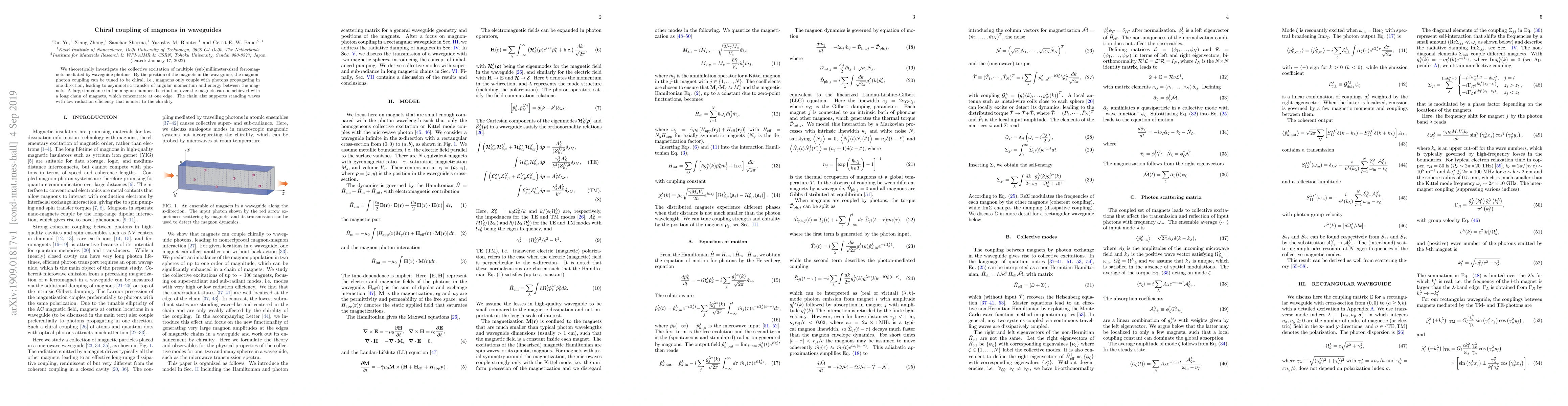 This research theoretically explores how magnets in a waveguide can be arranged to enable unidirectional, or chiral, coupling with photons. This tuning allows for an imbalance in energy and angular momentum transfer, concentrating magnons at one edge of a long magnet chain. The chain also supports standing waves with minimal energy loss, maintaining this chirality.