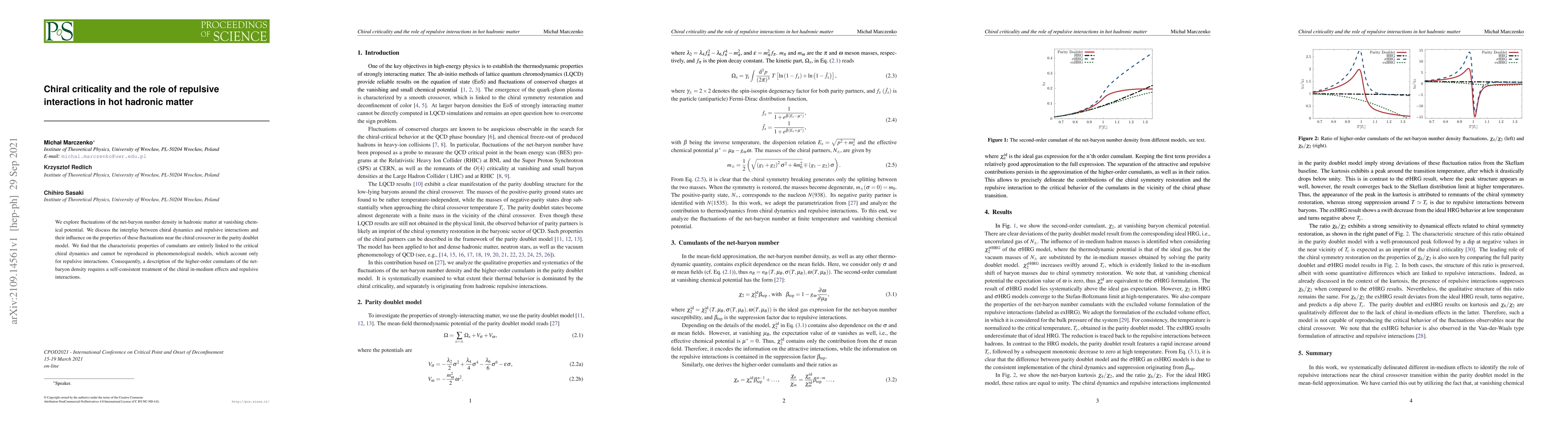 We explore fluctuations of the net-baryon number density in hadronic matter at vanishing chemical potential. We discuss the interplay between chiral dynamics and repulsive interactions and their influence on the properties of these fluctuations near the chiral crossover in the parity doublet model. We find that the characteristic properties of cumulants are entirely linked to the critical chiral dynamics and cannot be reproduced in phenomenological models, which account only for repulsive interactions. Consequently, a description of the higher-order cumulants of the net-baryon density requires a self-consistent treatment of the chiral in-medium effects and repulsive interactions.