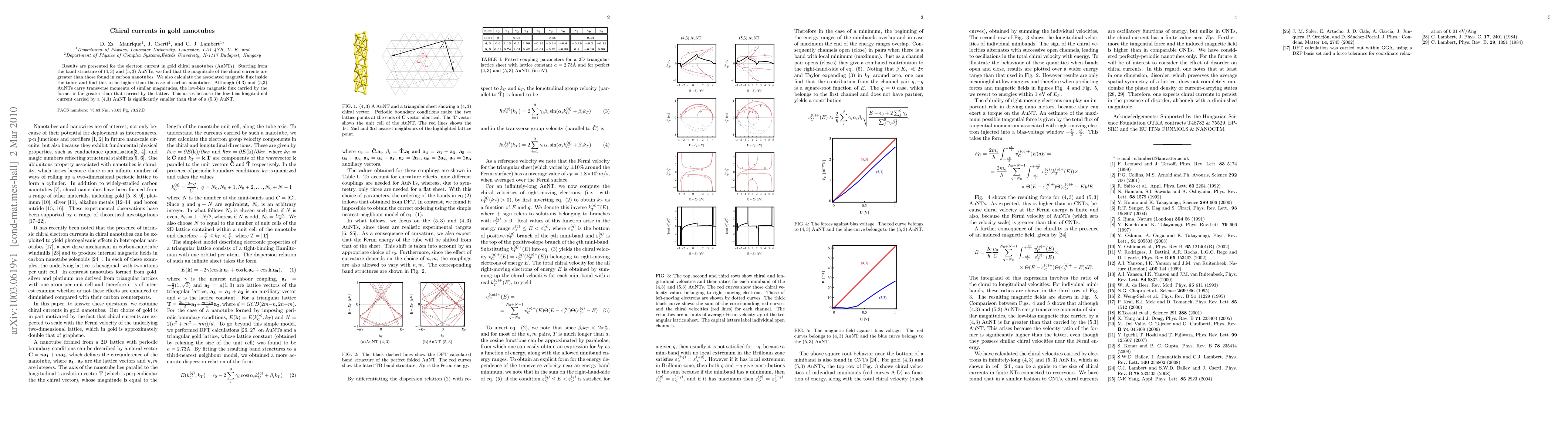 Results are presented for the electron current in gold chiral nanotubes (AuNTs). Starting from the band structure of (4,3) and (5,3) AuNTs, we find that the magnitude of the chiral currents are greater than those found in carbon nanotubes. We also calculate the associated magnetic flux inside the tubes and find this to be higher than the case of carbon nanotubes. Although (4,3) and (5,3) AuNTs carry transverse momenta of similar magnitudes, the low-bias magnetic flux carried by the former is far greater than that carried by the latter. This arises because the low-bias longitudinal current carried by a (4,3) AuNT is significantly smaller than that of a (5,3) AuNT.