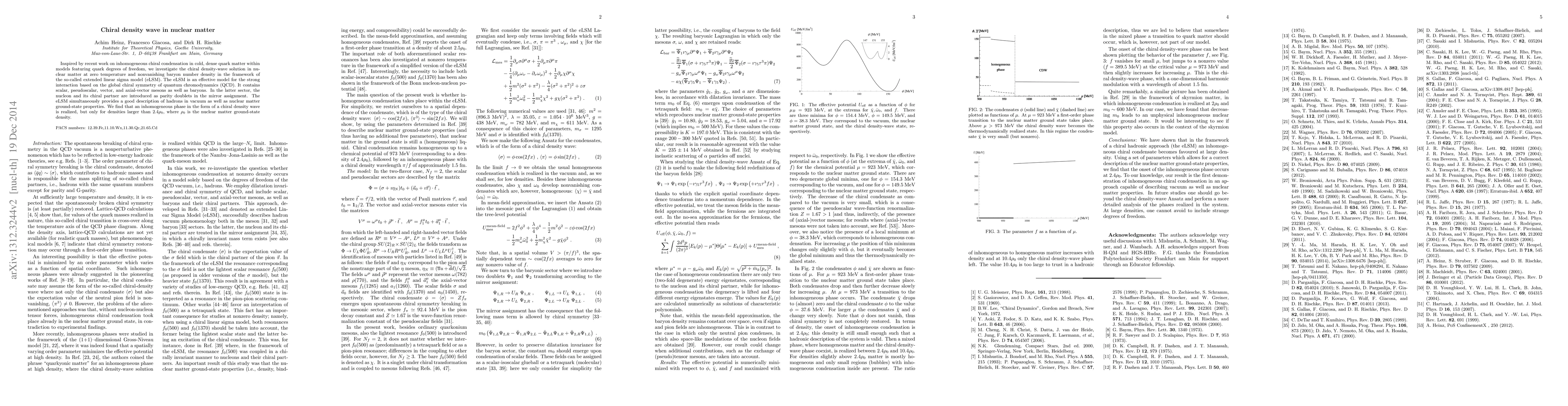 This paper explores the chiral density wave phase in nuclear matter at densities exceeding 2.4 times the nuclear matter ground-state density using the extended linear sigma model. The study reveals that such a chiral density wave emerges in the context of the model, which effectively describes both vacuum hadrons and nuclear matter properties.