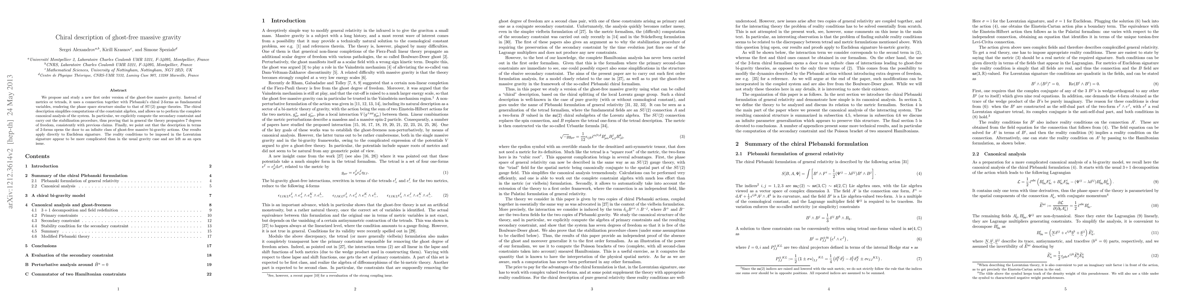 This paper proposes a novel first-order formulation of ghost-free massive gravity using a connection and chiral 2-forms, simplifying constraint algebra computations. It confirms the theory propagates 7 degrees of freedom and suggests an infinite class of bi-gravity actions, though reality conditions in Lorentzian signature remain complex.