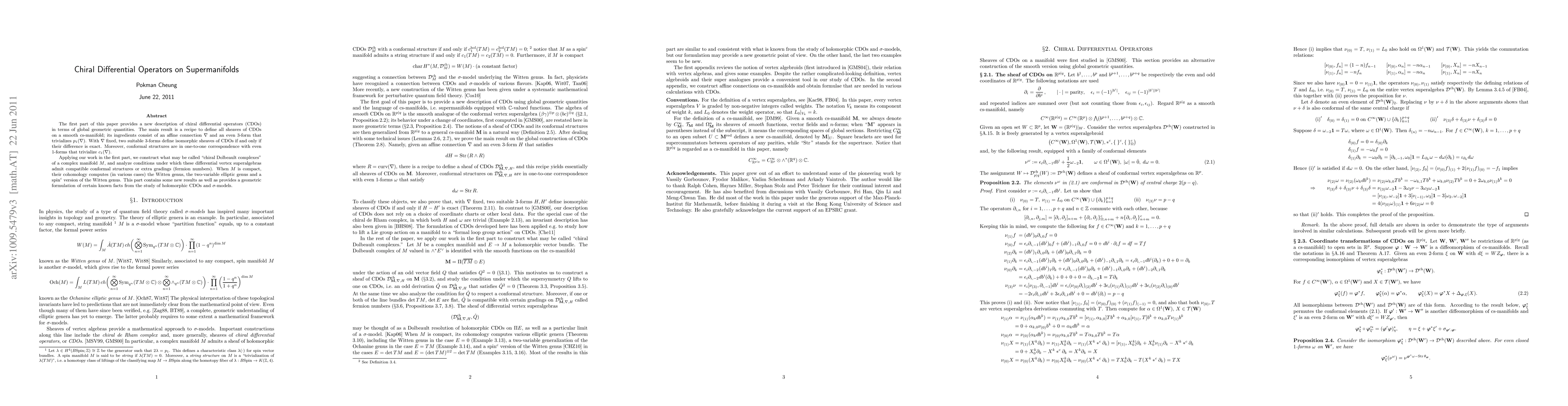 The first part of this paper provides a new formulation of chiral differential operators (CDOs) in terms of global geometric quantities. The main result is a recipe to define all sheaves of CDOs on a smooth cs-manifold; its ingredients consist of an affine connection and an even 3-form that trivializes the first Pontrjagin form. With the connection fixed, two suitable 3-forms define isomorphic sheaves of CDOs if and only if their difference is exact. Moreover, conformal structures are in one-to-one correspondence with even 1-forms that trivialize the first Chern form. Applying our work in the first part, we construct what may be called "chiral Dolbeault complexes" of a complex manifold M, and analyze conditions under which these differential vertex superalgebras admit compatible conformal structures or extra gradings (fermion numbers). When M is compact, their cohomology computes (in various cases) the Witten genus, the two-variable elliptic genus and a spin-c version of the Witten genus. This part contains some new results as well as provides a geometric formulation of certain known facts from the study of holomorphic CDOs and sigma models.