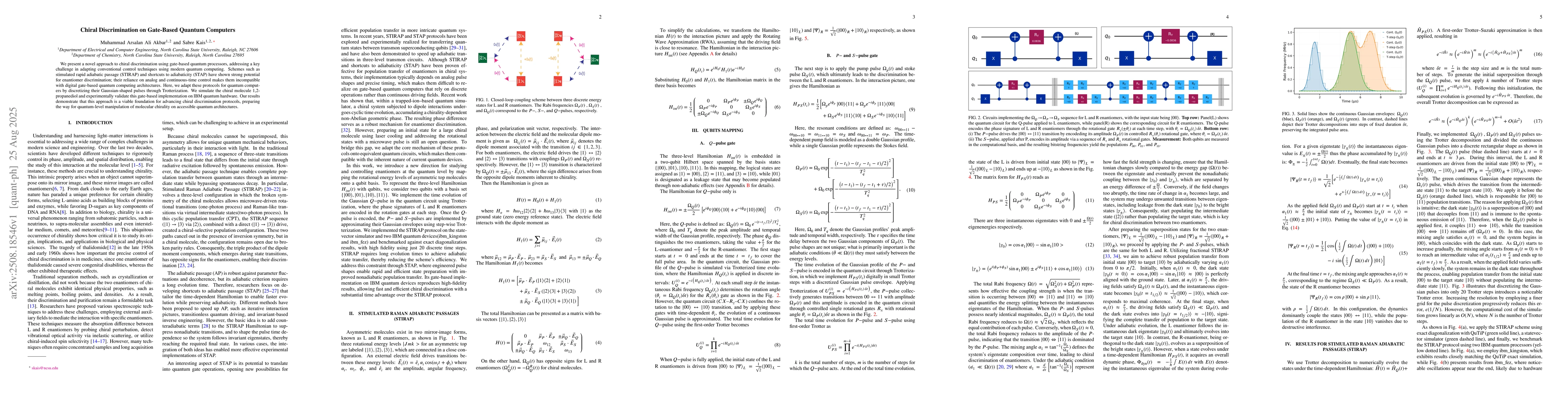 We present a novel approach to chiral discrimination using gate-based quantum processors, addressing a key challenge in adapting conventional control techniques using modern quantum computing. Schemes such as stimulated rapid adiabatic passage (STIRAP) and shortcuts to adiabaticity (STAP) have shown strong potential for enantiomer discrimination; their reliance on analog and continuous-time control makes them incompatible with digital gate-based quantum computing architectures. Here, we adapt these protocols for quantum computers by discretizing their Gaussian-shaped pulses through Trotterization. We simulate the chiral molecule 1,2-propanediol and experimentally validate this gate-based implementation on IBM quantum hardware. Our results demonstrate that this approach is a viable foundation for advancing chiral discrimination protocols, preparing the way for quantum-level manipulation of molecular chirality on accessible quantum architectures.