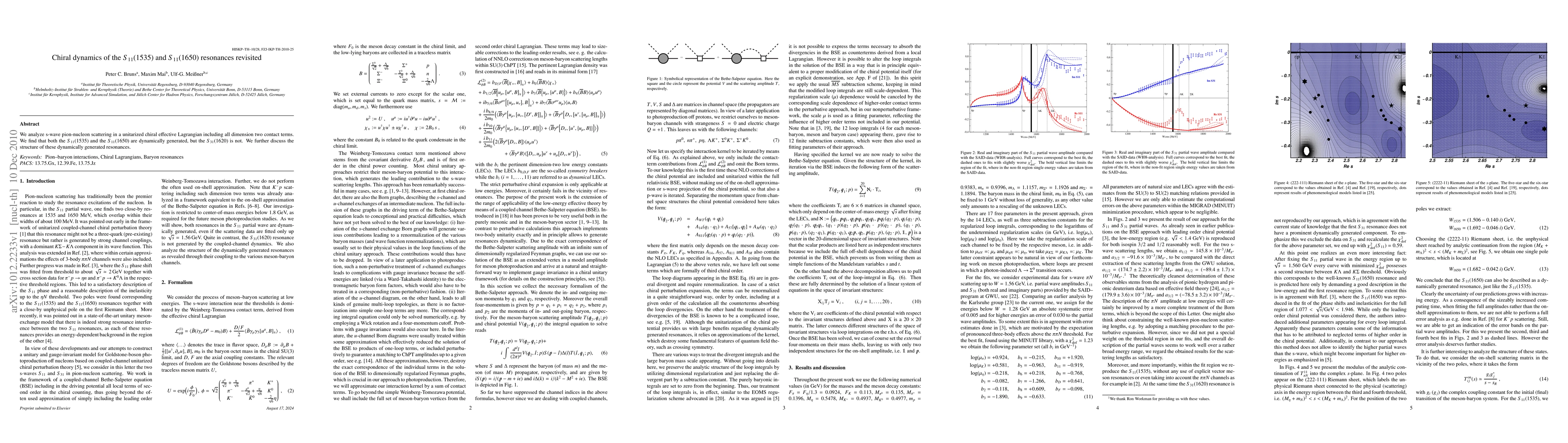 Researchers analyzed pion-nucleon scattering to find that two resonances (S11(1535) and S11(1650)) are dynamically generated in a chiral effective Lagrangian, while a third resonance is not. This suggests the resonances have specific structures.