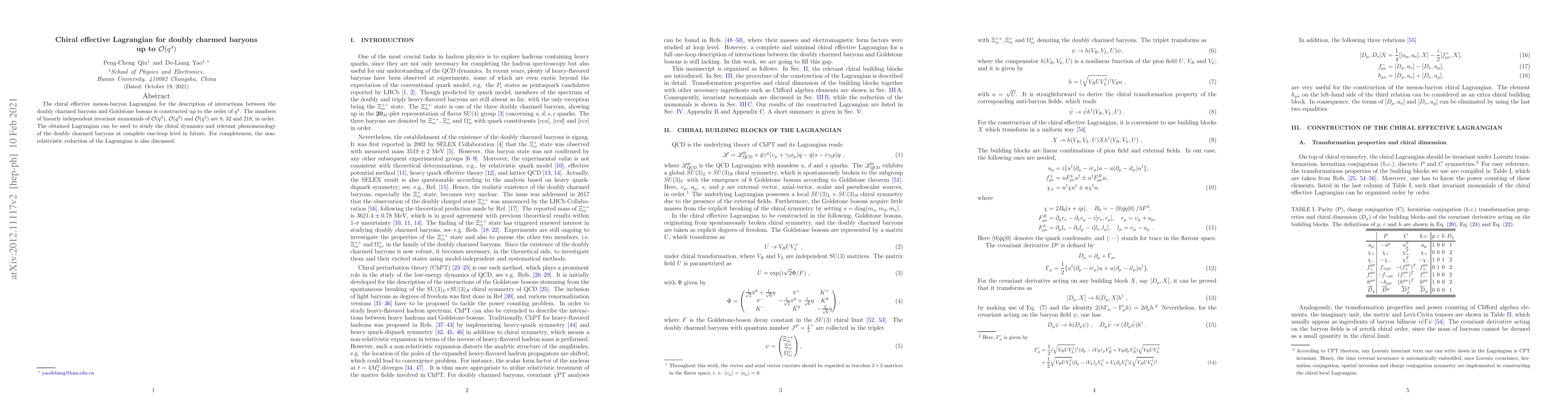 This paper constructs a chiral effective Lagrangian for doubly charmed baryons up to $\mathcal{O}(q^4)$, detailing the interactions between these baryons and Goldstone bosons. The Lagrangian includes 8, 32, and 218 linearly independent terms at $\mathcal{O}(q^2)$, $\mathcal{O}(q^3)$, and $\mathcal{O}(q^4)$, respectively, and can be used to study their chiral dynamics and phenomenology at the one-loop level.