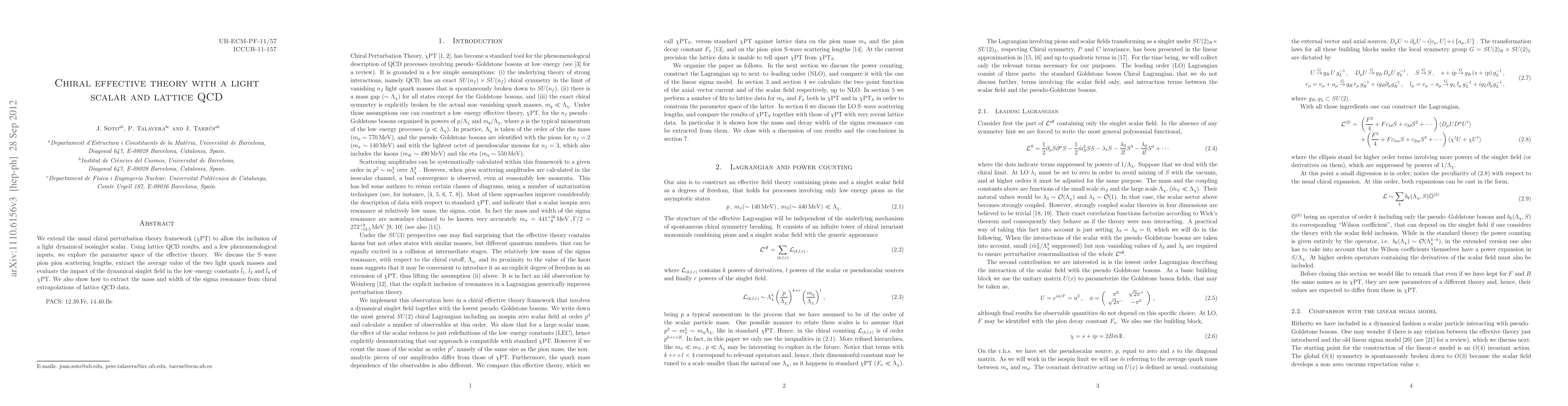 We extend the usual chiral perturbation theory framework ($\chi$PT) to allow the inclusion of a light dynamical isosinglet scalar. Using lattice QCD results, and a few phenomenological inputs, we explore the parameter space of the effective theory. We discuss the S-wave pion-pion scattering lengths, extract the average value of the two light quark masses and evaluate the impact of the dynamical singlet field in the low--energy constants $\bar{l}_1$, $\bar{l}_3$ and $\bar{l}_4$ of $\chi$PT. We also show how to extract the mass and width of the sigma resonance from chiral extrapolations of lattice QCD data.