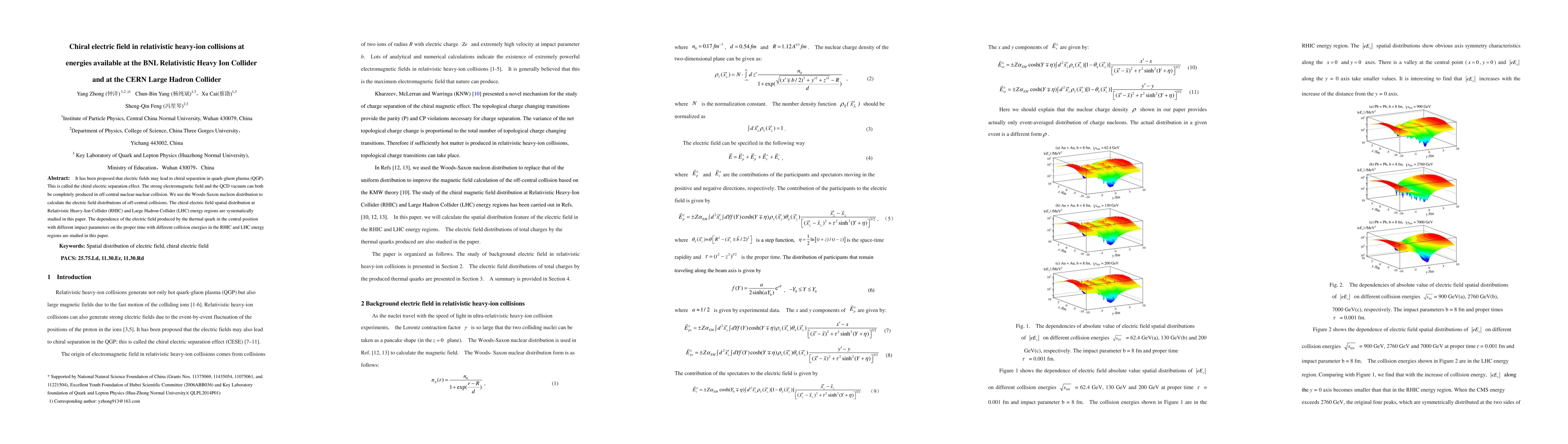 This paper investigates the chiral electric field's spatial distribution in relativistic heavy-ion collisions at RHIC and LHC energies, proposing the chiral electric separation effect in quark-gluon plasma. It employs the Wood-Saxon nucleon distribution model to compare electric and magnetic field features in off-central collisions.
