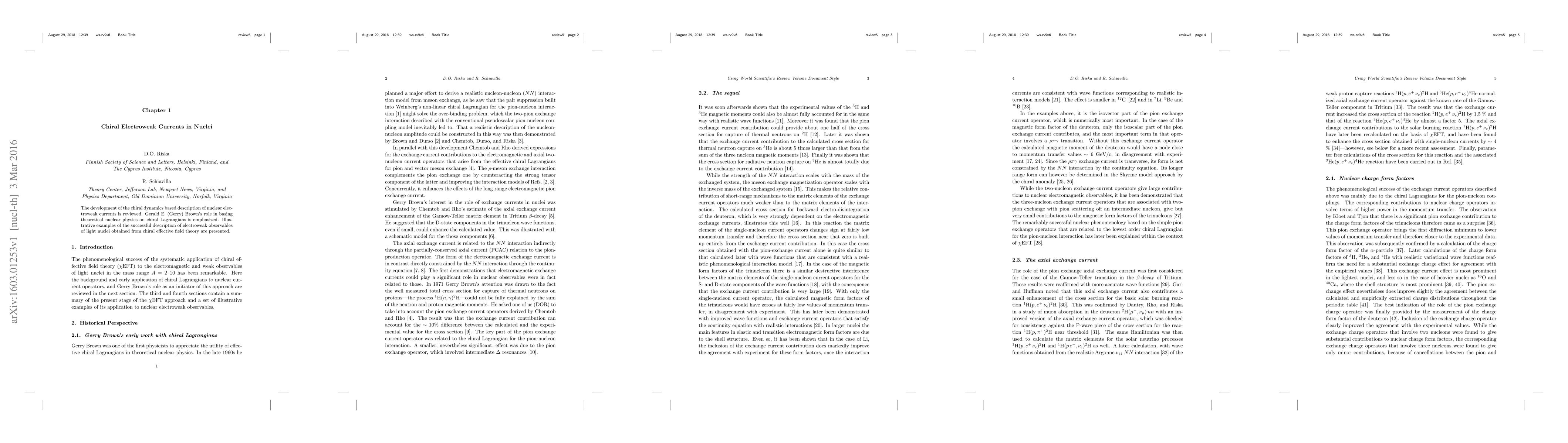 The development of the chiral dynamics based description of nuclear electroweak currents is reviewed. Gerald E. (Gerry) Brown's role in basing theoretical nuclear physics on chiral Lagrangians is emphasized. Illustrative examples of the successful description of electroweak observables of light nuclei obtained from chiral effective field theory are presented.