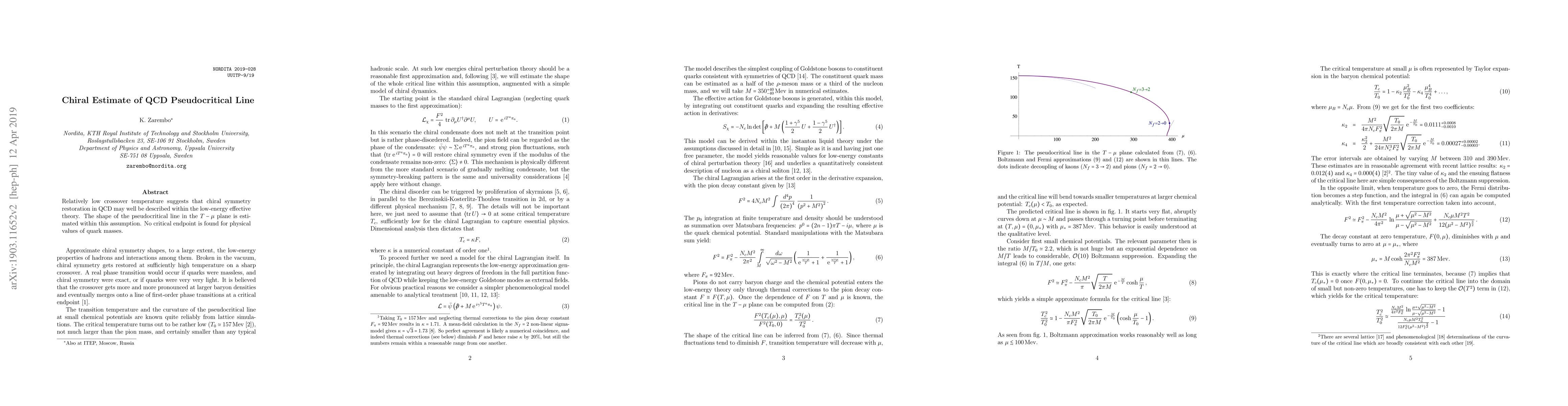 Summary: The study estimates the chiral symmetry restoration in QCD at relatively low crossover temperatures, suggesting a description via low-energy effective theory. It finds no critical endpoint for the pseudocritical line in the T-mu plane at physical quark masses.