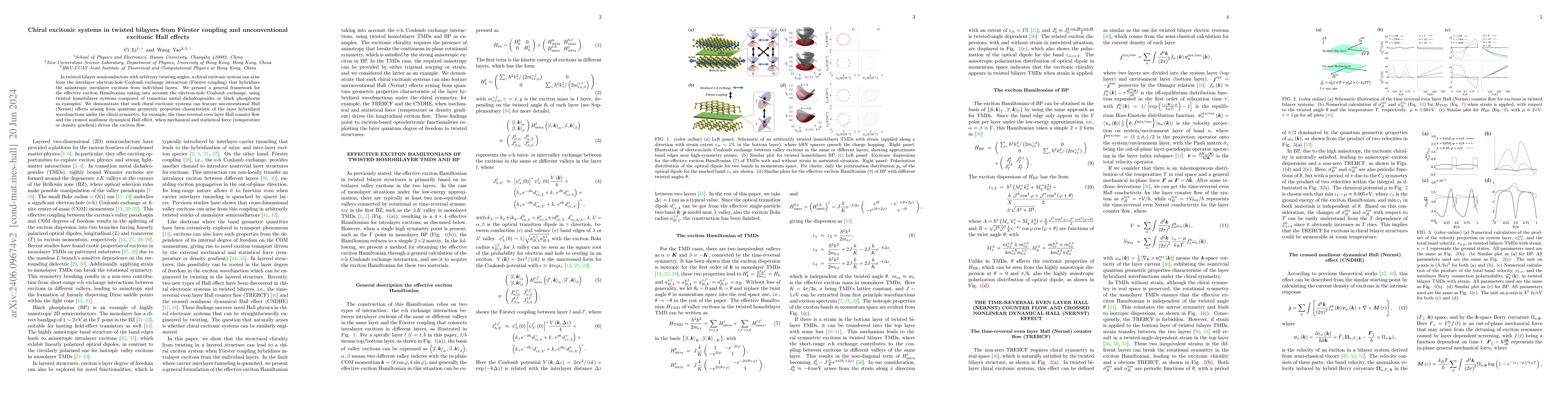 This paper develops a framework for understanding chiral excitonic systems in twisted bilayer semiconductors, showing that Förster coupling leads to hybridized excitons. It reveals unconventional Hall effects emerging from quantum geometric properties in these systems, driven by mechanical or statistical forces.
