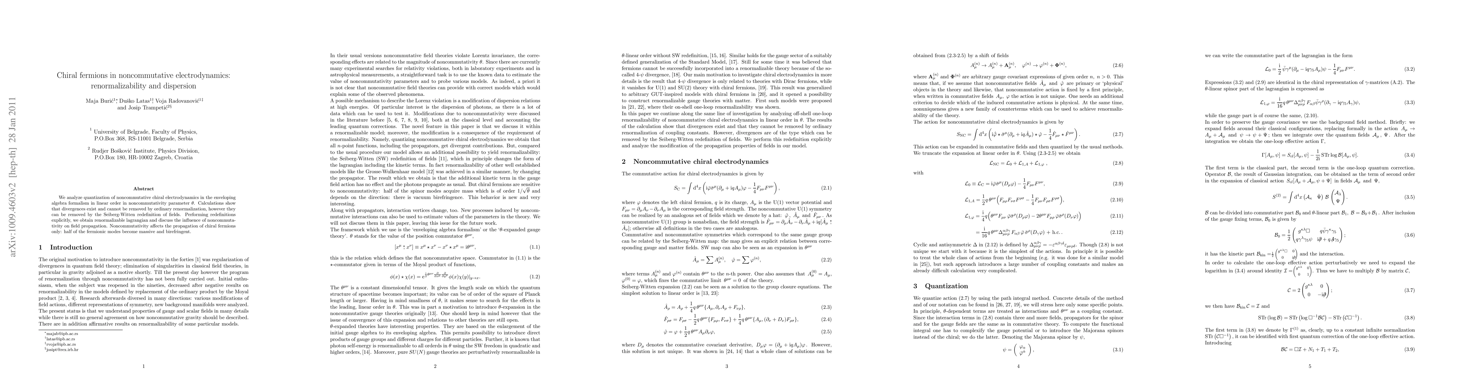 We analyze quantization of noncommutative chiral electrodynamics in the enveloping algebra formalism in linear order in noncommutativity parameter $\theta$. Calculations show that divergences exist and cannot be removed by ordinary renormalization, however they can be removed by the Seiberg-Witten redefinition of fields. Performing the redefinitions explicitly, we obtain renormalizable lagrangian and discuss the influence of noncommutativity on field propagation. Noncommutativity affects the propagation of chiral fermions only: half of the fermionic modes become massive and birefringent.