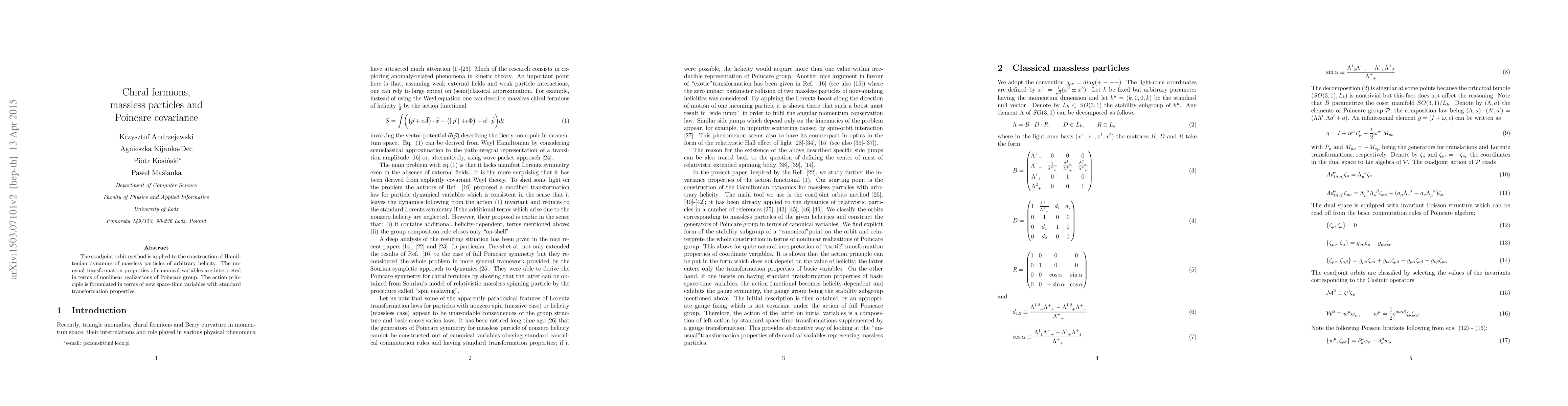 This paper applies the coadjoint orbit method to develop Hamiltonian dynamics for massless particles of any helicity, interpreting their canonical variables through nonlinear Poincare group realizations. It reformulates the action principle using new space-time variables with conventional transformation properties.