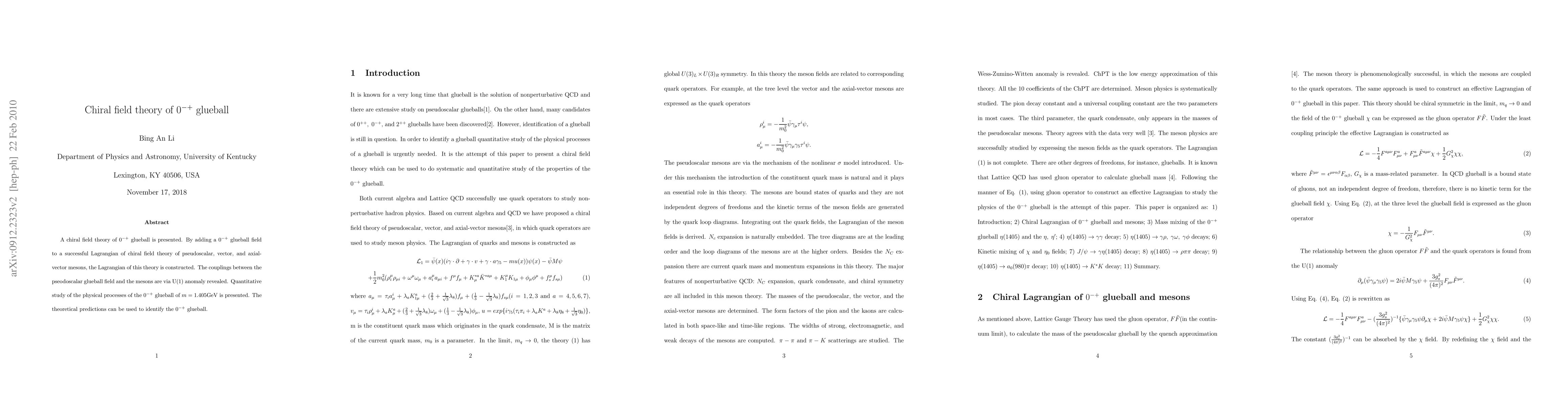 A chiral field theory of $0^{-+}$ glueball is presented. By adding a $0^{-+}$ glueball field to a successful Lagrangian of chiral field theory of pseudoscalar, vector, and axial-vector mesons, the Lagrangian of this theory is constructed. The couplings between the pseodoscalar glueball field and mesons are via U(1) anomaly revealed. Qualitative study of the physical processes of the $0^{-+}$ glueball of $m=1.405\textrm{GeV}$ is presented. The theoretical predictions can be used to identify the $0^{-+}$ glueball.