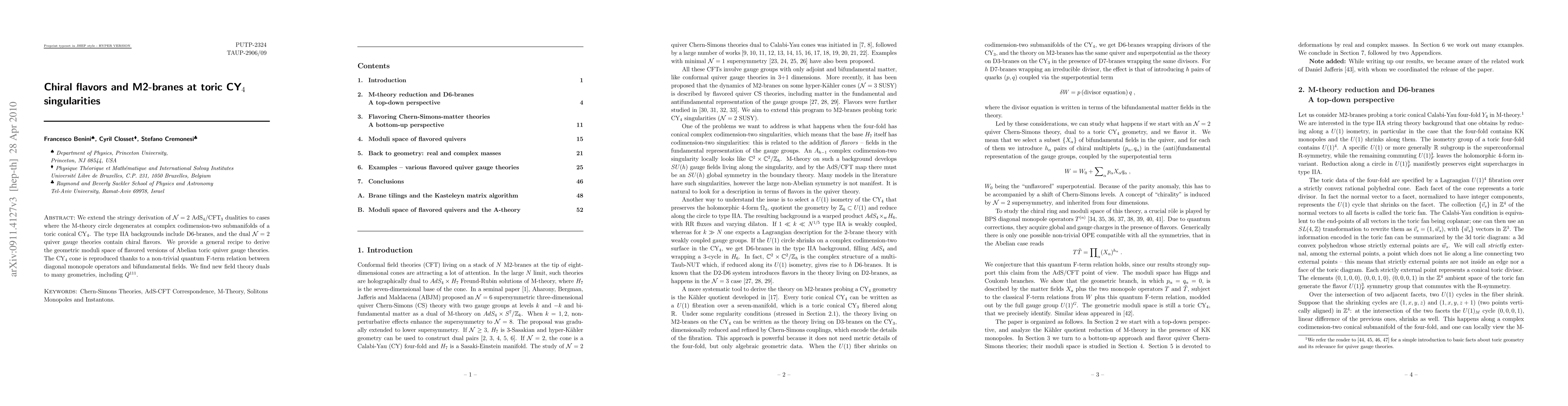 We extend the stringy derivation of N=2 AdS4/CFT3 dualities to cases where the M-theory circle degenerates at complex codimension-two submanifolds of a toric conical CY4. The type IIA backgrounds include D6-branes, and the dual N=2 quiver gauge theories contain chiral flavors. We provide a general recipe to derive the geometric moduli space of flavored versions of Abelian toric quiver gauge theories. The CY4 cone is reproduced thanks to a non-trivial quantum F-term relation between diagonal monopole operators and bifundamental fields. We find new field theory duals to many geometries, including Q111.