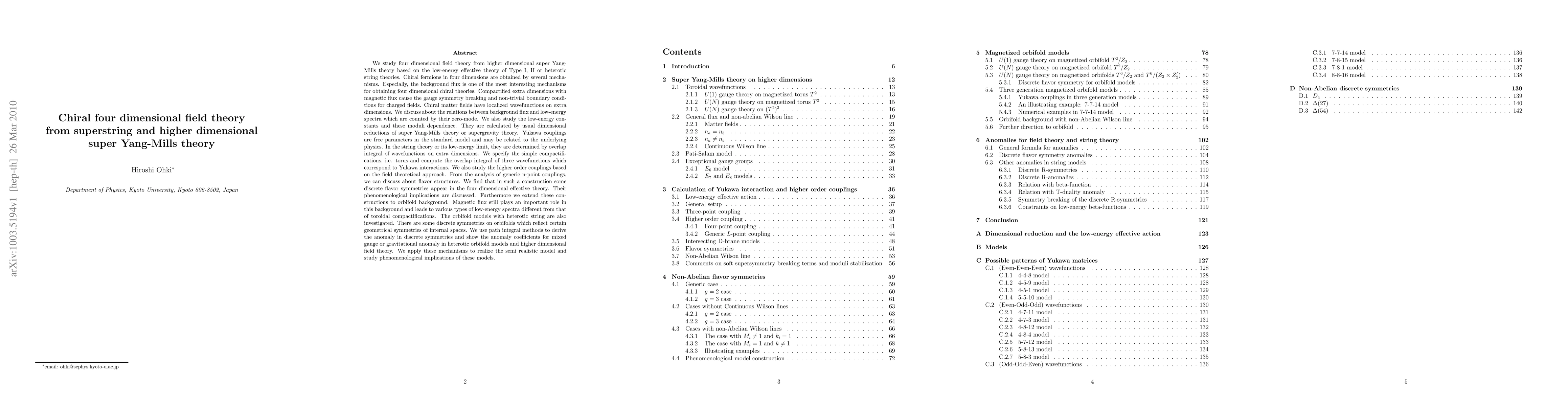 We study four dimensional field theory from the low-energy effective theory of Type I, II or heterotic string theories. Chiral fermions in four dimensions are obtained by several mechanisms. Especially, the background flux is one of the most interesting mechanisms for obtaining four dimensional chiral theories. Chiral matter fields have localized wavefunctions on extra dimensions. We discuss about the relations between background flux and low-energy spectra which are counted by their zero-modes. Yukawa couplings are free parameters in the standard model and may be related to the underlying physics. In the string theory or its low-energy limit, they are determined by overlap integral of wavefunctions on extra dimensions. We also study the higher order couplings based on the field theoretical approach. From the analysis of generic n-point couplings, we can discuss about flavor structures. We find that in such a construction some discrete flavor symmetries appear in the four dimensional effective theory. Their phenomenological implications are discussed. Furthermore we extend these constructions to orbifold background. Magnetic flux still plays an important role and leads to various types of low-energy spectra different from that of toroidal compactifications. The orbifold models with heterotic string are also investigated.
