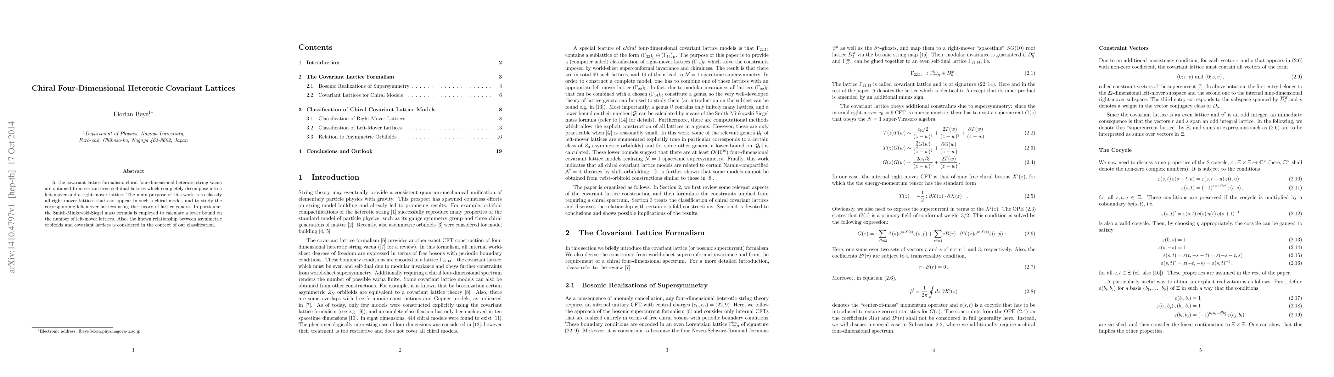 In the covariant lattice formalism, chiral four-dimensional heterotic string vacua are obtained from certain even self-dual lattices which completely decompose into a left-mover and a right-mover lattice. The main purpose of this work is to classify all right-mover lattices that can appear in such a chiral model, and to study the corresponding left-mover lattices using the theory of lattice genera. In particular, the Smith-Minkowski-Siegel mass formula is employed to calculate a lower bound on the number of left-mover lattices. Also, the known relationship between asymmetric orbifolds and covariant lattices is considered in the context of our classification.