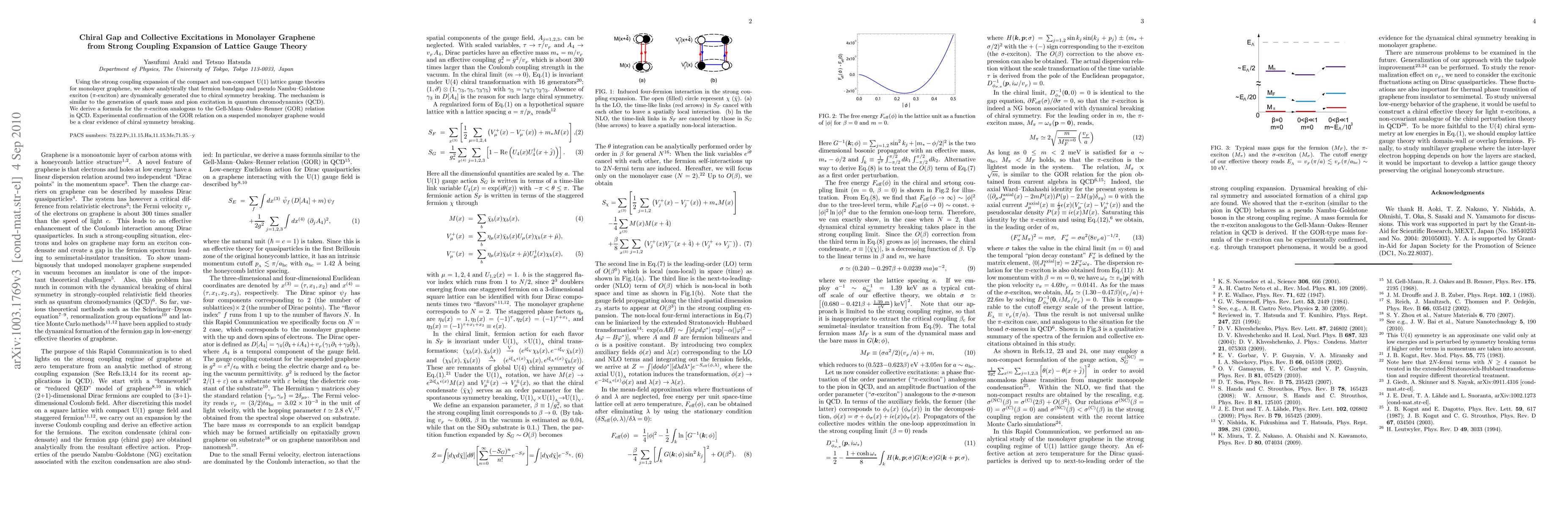 This paper demonstrates that chiral symmetry breaking in monolayer graphene via strong coupling expansion of lattice gauge theory generates a fermion bandgap and pseudo Nambu-Goldstone exciton (pi-exciton). The pi-exciton's generation mechanism parallels quark mass and pion excitation in quantum chromodynamics, with a derived formula analogous to the Gell-Mann-Oakes-Renner relation.