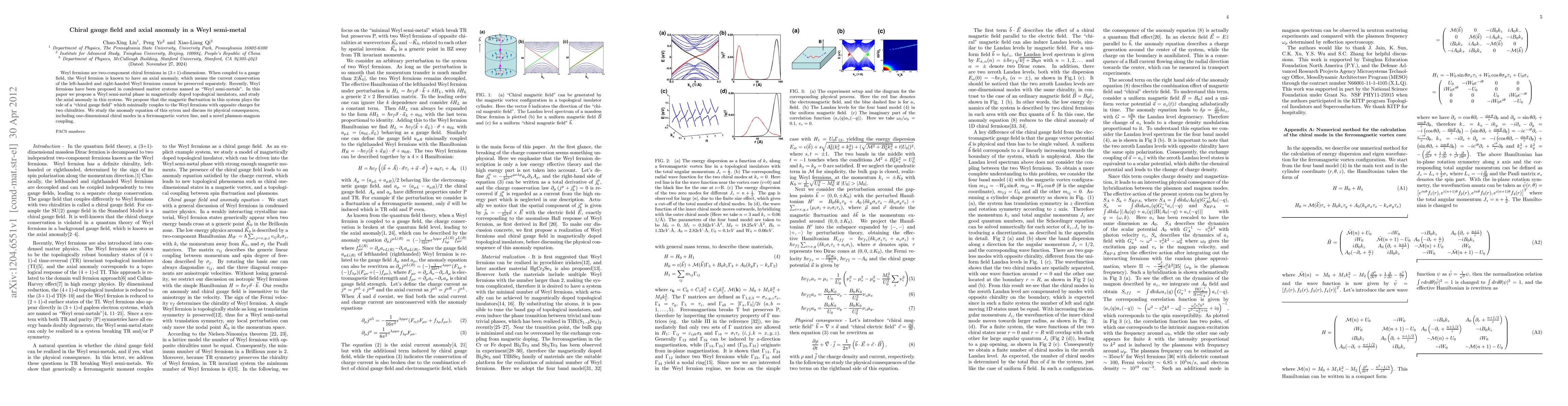 This paper investigates the axial anomaly in Weyl semi-metals, proposing that magnetic fluctuations act as a chiral gauge field in magnetically doped topological insulators. It explores the anomaly equation's implications, including unique chiral modes and plasmon-magnon interactions.
