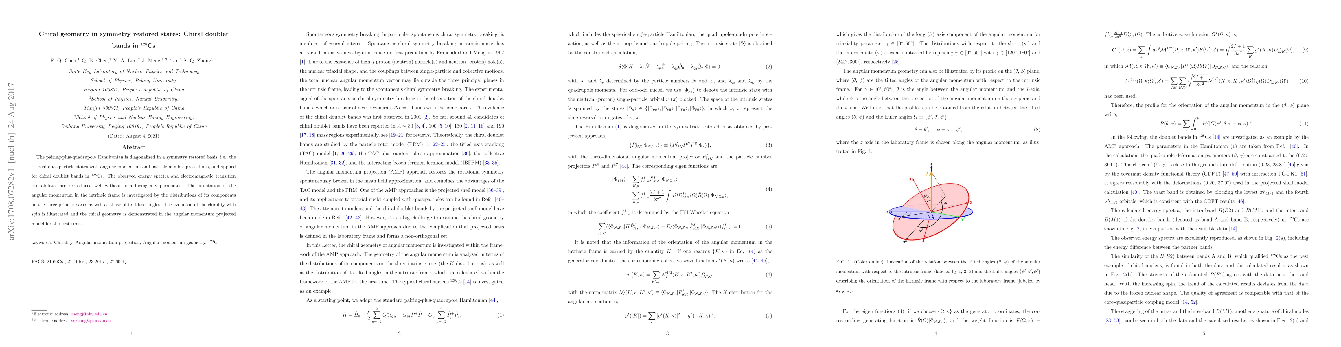 The pairing-plus-quadrupole Hamiltonian is diagonalized in a symmetry restored basis, i.e., the triaxial quasiparticle-states with angular momentum and particle number projections, and applied for chiral doublet bands in 128Cs. The observed energy spectra and electromagnetic transition probabilities are reproduced well without introducing any parameter. The orientation of the angular momentum in the intrinsic frame is investigated by the distributions of its components on the three principle axes as well as those of its tilted angles. The evolution of the chirality with spin is illustrated and the chiral geometry is demonstrated in the angular momentum projected model for the first time.