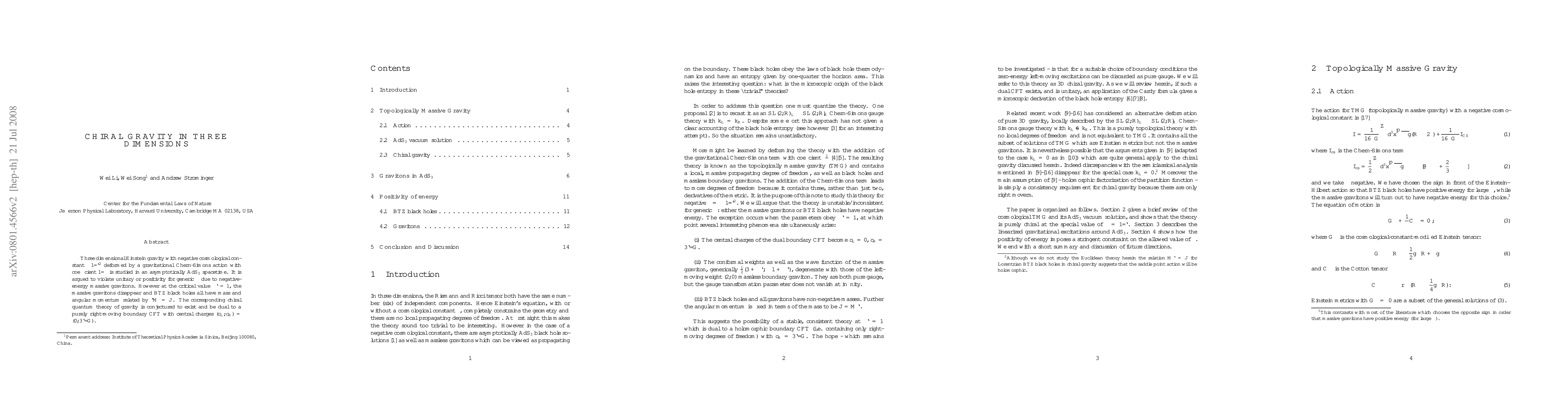 Three dimensional Einstein gravity with negative cosmological constant -1/\ell^2 deformed by a gravitational Chern-Simons action with coefficient 1/\mu is studied in an asymptotically AdS_3 spacetime. It is argued to violate unitary or positivity for generic \mu due to negative-energy massive gravitons. However at the critical value \mu\ell=1, the massive gravitons disappear and BTZ black holes all have mass and angular momentum related by \ell M=J. The corresponding chiral quantum theory of gravity is conjectured to exist and be dual to a purely right-moving boundary CFT with central charges (c_L,c_R)=(0,3\ell /G).