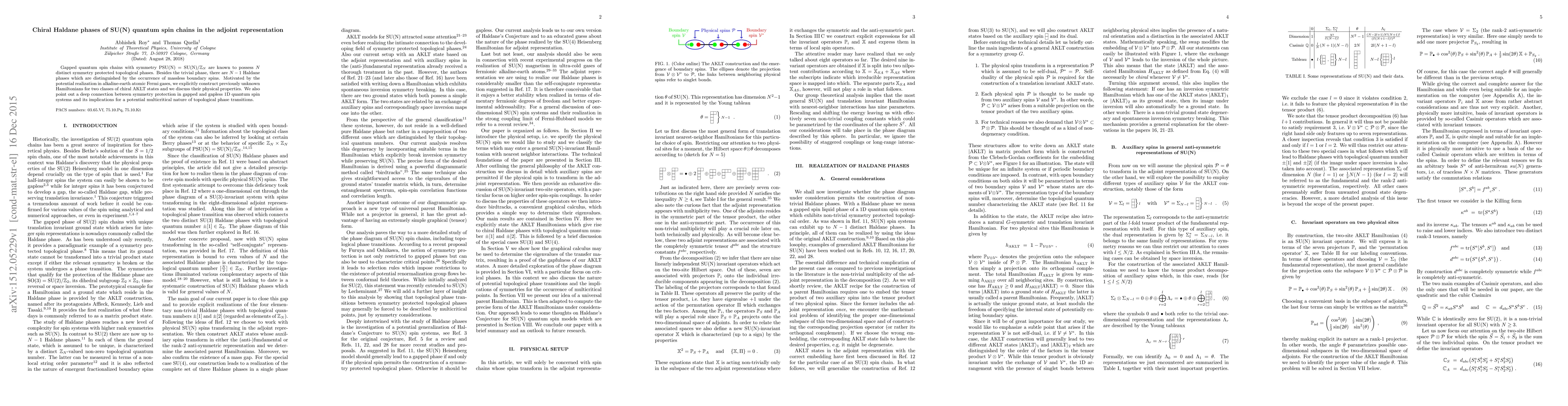 Gapped quantum spin chains with symmetry PSU(N)=SU(N)/Z(N) are known to possess N distinct symmetry protected topological phases. Besides the trivial phase, there are N-1 Haldane phases which are distinguished by the occurrence of massless boundary spins. Motivated by the potential realization in alkaline-earth atomic Fermi gases, we explicitly construct previously unknown Hamiltonians for two classes of chiral AKLT states and we discuss their physical properties. We also point out a deep connection between symmetry protection in gapped and gapless 1D quantum spin systems and its implications for a potential multicritical nature of topological phase transitions.