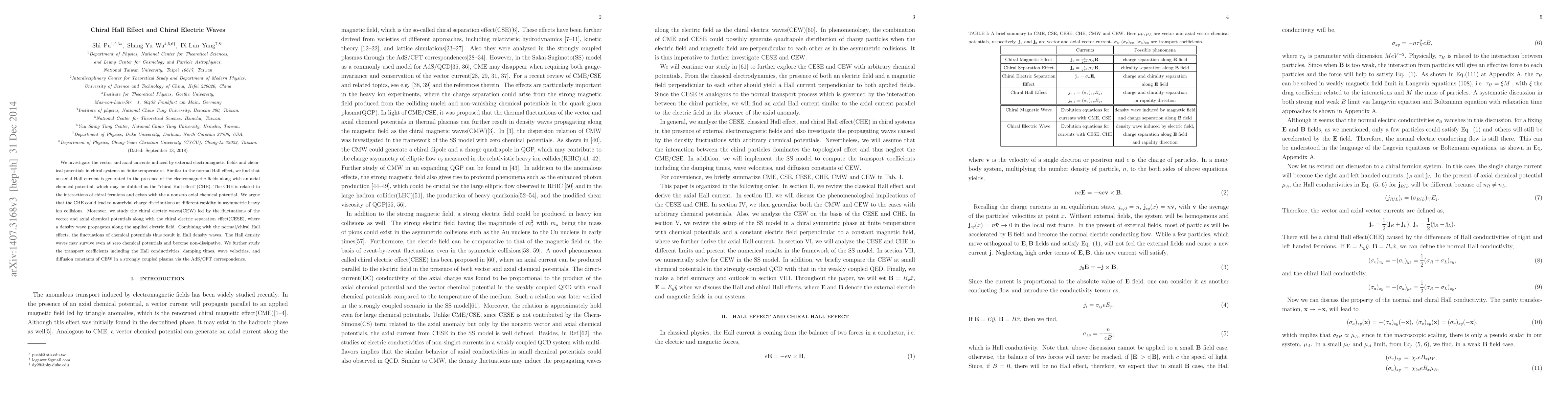 We investigate the vector and axial currents induced by external electromagnetic fields and chemical potentials in chiral systems at finite temperature. Similar to the normal Hall effect, we find that an axial Hall current is generated in the presence of the electromagnetic fields along with an axial chemical potential, which may be dubbed as the "chiral Hall effect"(CHE). The CHE is related to the interactions of chiral fermions and exists with the a nonzero axial chemical potential. We argue that the CHE could lead to nontrivial charge distributions at different rapidity in asymmetric heavy ion collisions. Moreover, we study the chiral electric waves(CEW) led by the fluctuations of the vector and axial chemical potentials along with the chiral electric separation effect(CESE), where a density wave propagates along the applied electric field. Combining with the normal/chiral Hall effects, the fluctuations of chemical potentials thus result in Hall density waves. The Hall density waves may survive even at zero chemical potentials and become non-dissipative. We further study the transport coefficients including the Hall conductivities, damping times, wave velocities, and diffusion constants of CEW in a strongly coupled plasma via the AdS/CFT correspondence.
