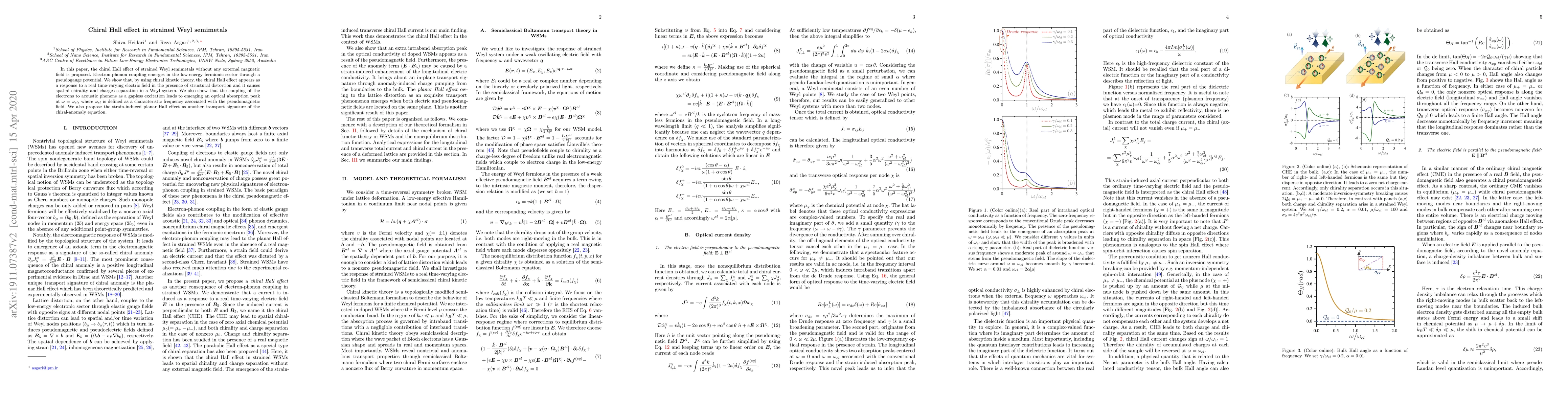 This research explores the chiral Hall effect in strained Weyl semimetals, demonstrating its emergence via electron-phonon coupling in the absence of an external magnetic field. The effect results in spatial chirality and charge separation, linked to an optical absorption peak at a characteristic frequency, and introduces the strain-induced planar Hall effect as a further transport signature.