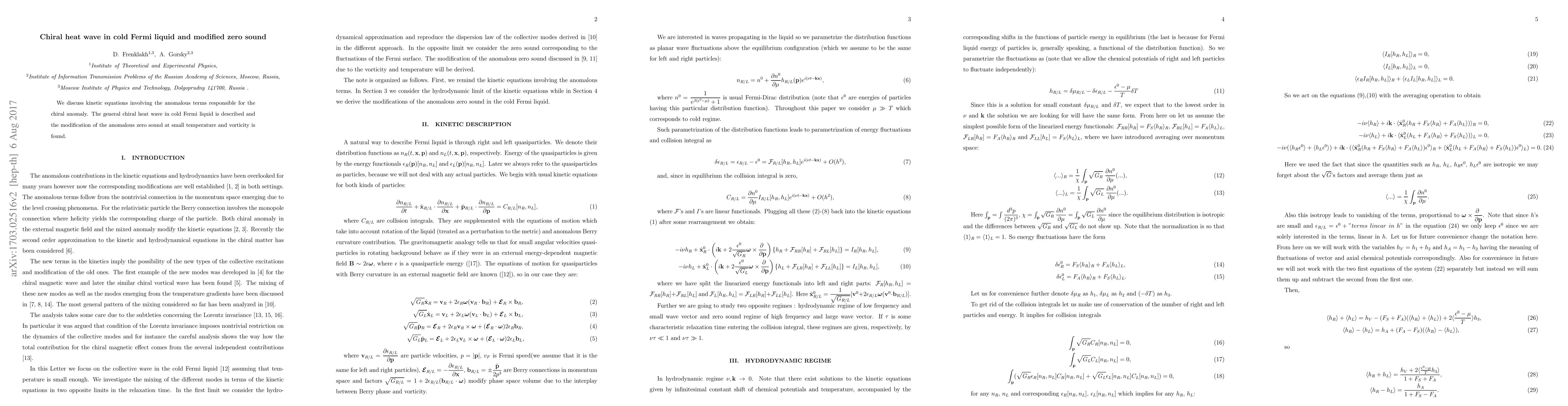 This paper investigates kinetic equations with anomalous terms associated with the chiral anomaly in cold Fermi liquids, demonstrating a chiral heat wave phenomenon and revealing modifications to zero sound behavior under low temperature and vorticity conditions.