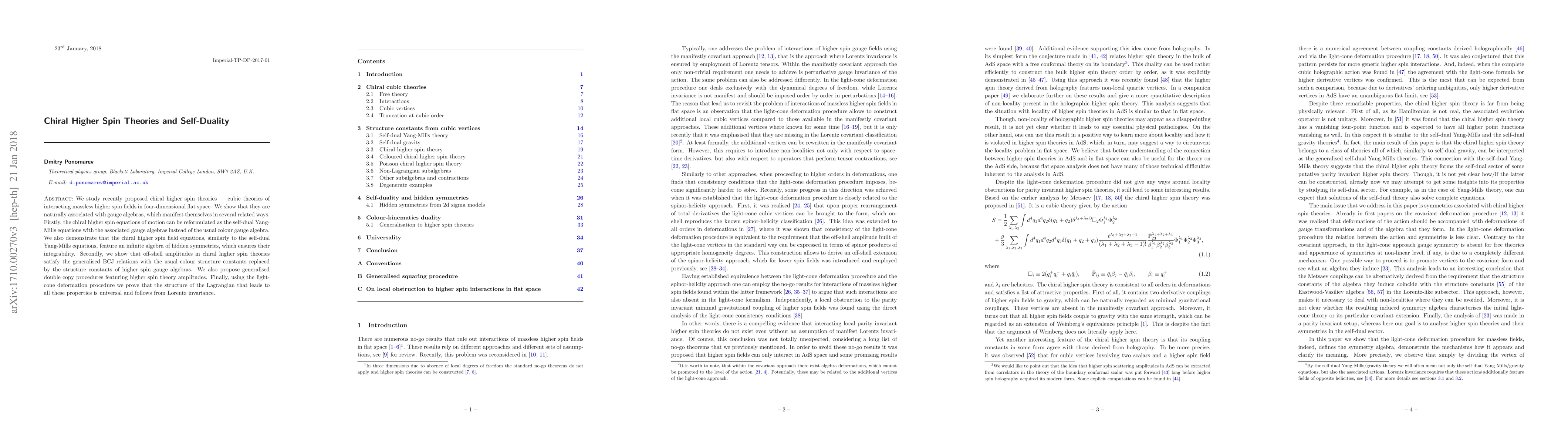 We study recently proposed chiral higher spin theories - cubic theories of interacting massless higher spin fields in four-dimensional flat space. We show that they are naturally associated with gauge algebras, which manifest themselves in several related ways. Firstly, the chiral higher spin equations of motion can be reformulated as the self-dual Yang-Mills equations with the associated gauge algebras instead of the usual colour gauge algebra. We also demonstrate that the chiral higher spin field equations, similarly to the self-dual Yang-Mills equations, feature an infinite algebra of hidden symmetries, which ensures their integrability. Secondly, we show that off-shell amplitudes in chiral higher spin theories satisfy the generalised BCJ relations with the usual colour structure constants replaced by the structure constants of higher spin gauge algebras. We also propose generalised double copy procedures featuring higher spin theory amplitudes. Finally, using the light-cone deformation procedure we prove that the structure of the Lagrangian that leads to all these properties is universal and follows from Lorentz invariance.