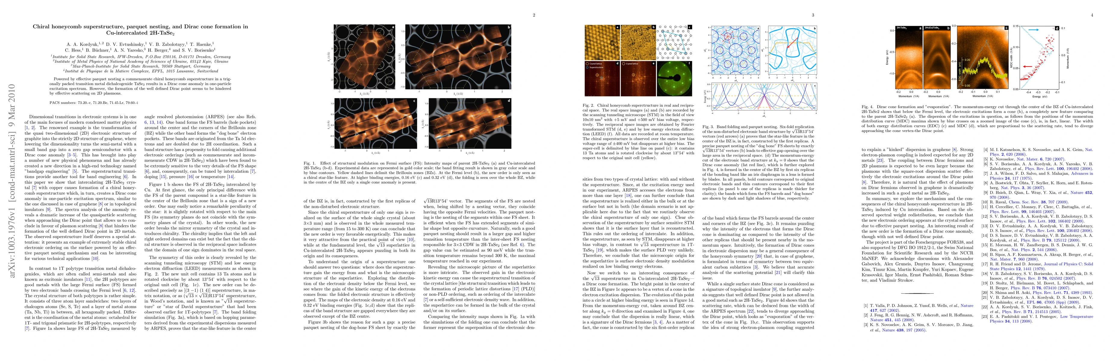 Summary: Cu-intercalated 2H-TaSe2 exhibits a chiral honeycomb superstructure due to parquet nesting, leading to a Dirac cone anomaly. However, the formation of a well-defined Dirac point is obstructed by scattering from 2D plasmons.