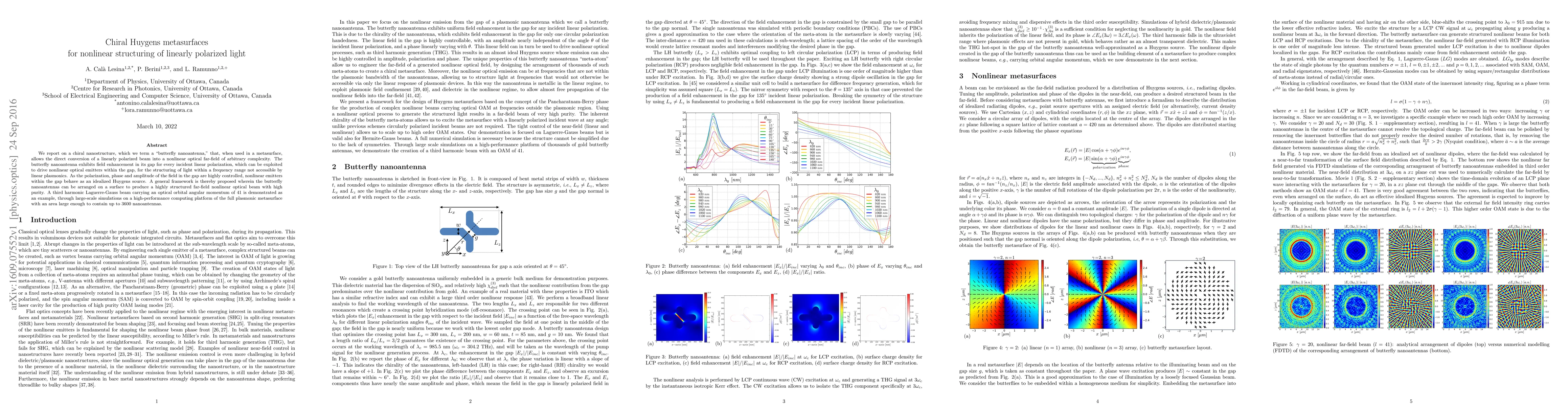 We report on a chiral nanostructure, which we term a "butterfly nanoantenna," that, when used in a metasurface, allows the direct conversion of a linearly polarized beam into a nonlinear optical far-field of arbitrary complexity. The butterfly nanoantenna exhibits field enhancement in its gap for every incident linear polarization, which can be exploited to drive nonlinear optical emitters within the gap, for the structuring of light within a frequency range not accessible by linear plasmonics. As the polarization, phase and amplitude of the field in the gap are highly controlled, nonlinear emitters within the gap behave as an idealized Huygens source. A general framework is thereby proposed wherein the butterfly nanoantennas can be arranged on a surface to produce a highly structured far-field nonlinear optical beam with high purity. A third harmonic Laguerre-Gauss beam carrying an optical orbital angular momentum of 41 is demonstrated as an example, through large-scale simulations on a high-performance computing platform of the full plasmonic metasurface with an area large enough to contain up to 3600 nanoantennas.