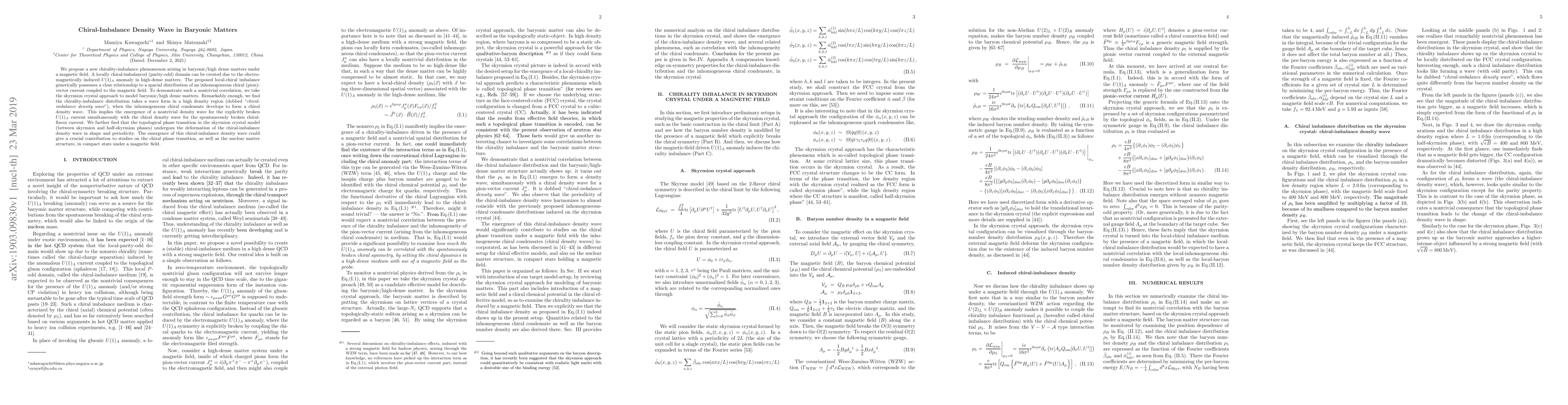 We propose a new chirality-imbalance phenomenon arising in baryonic/high dense matters under a magnetic field. A locally chiral-imbalanced (parity-odd) domain can be created due to the electromagnetically induced $U(1)_A$ anomaly in high-dense matters. The proposed local-chiral imbalance generically possesses a close relationship to a spacial distribution of an inhomogeneous chiral (pion)-vector current coupled to the magnetic field. To demonstrate such a nontrivial correlation, we take the skyrmion crystal approach to model baryonic/high dense matters. Remarkably enough, we find the chirality-imbalance distribution takes a wave form in a high density region (dobbed ``chiral-imbalance density wave''), when the inhomogeneous chiral condensate develops to form a chiral density wave. This implies the emergence of a nontrivial density wave for the explicitly broken $U(1)_A$ current simultaneously with the chiral density wave for the spontaneously broken chiral-flavor current. We further find that the topological phase transition in the skyrmion crystal model (between skyrmion and half-skyrmion phases) undergoes the deformation of the chiral-imbalance density wave in shape and periodicity. The emergence of this chiral-imbalance density wave could give a crucial contribution to studies on the chiral phase transition, as well as the nuclear matter structure, in compact stars under a magnetic field.