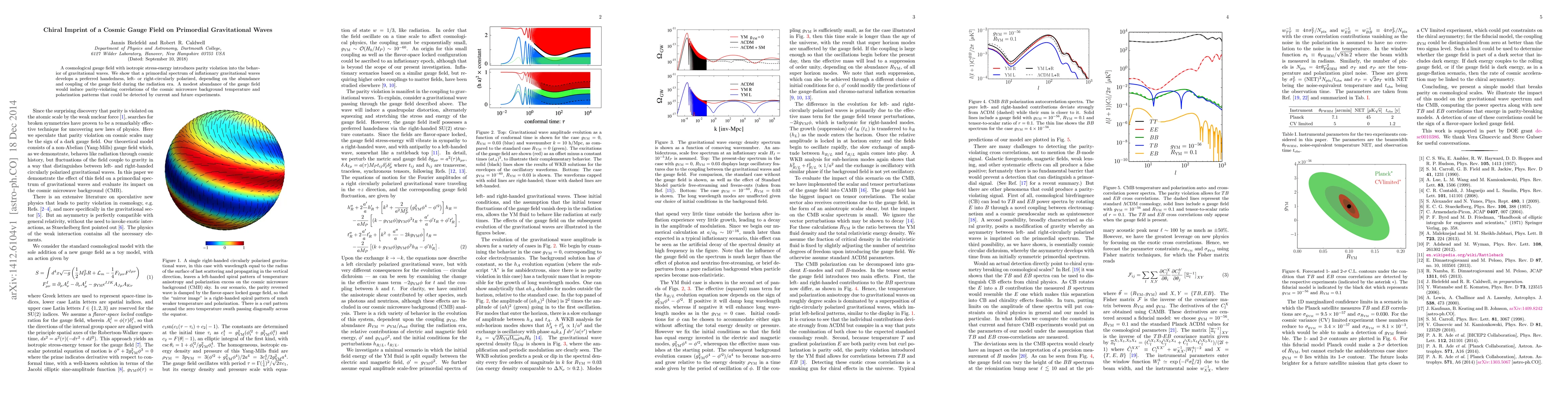 A cosmological gauge field with isotropic stress-energy introduces parity violation into the behavior of gravitational waves. We show that a primordial spectrum of inflationary gravitational waves develops a preferred handedness, left- or right-circularly polarized, depending on the abundance and coupling of the gauge field during the radiation era. A modest abundance of the gauge field would induce parity-violating correlations of the cosmic microwave background temperature and polarization patterns that could be detected by current and future experiments.