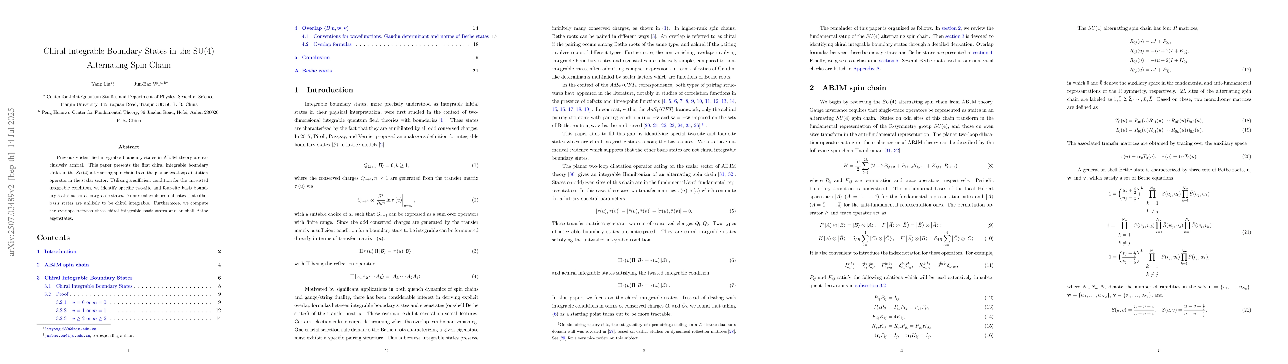 Previously identified integrable boundary states in ABJM theory are exclusively achiral. This paper presents the first chiral integrable boundary states in the $SU(4)$ alternating spin chain from the planar two-loop dilatation operator in the scalar sector. Utilizing a sufficient condition for the untwisted integrable condition, we identify specific two-site and four-site basis boundary states as chiral integrable states. Numerical evidence indicates that other basis states are unlikely to be chiral integrable. Furthermore, we compute the overlaps between these chiral integrable basis states and on-shell Bethe eigenstates.